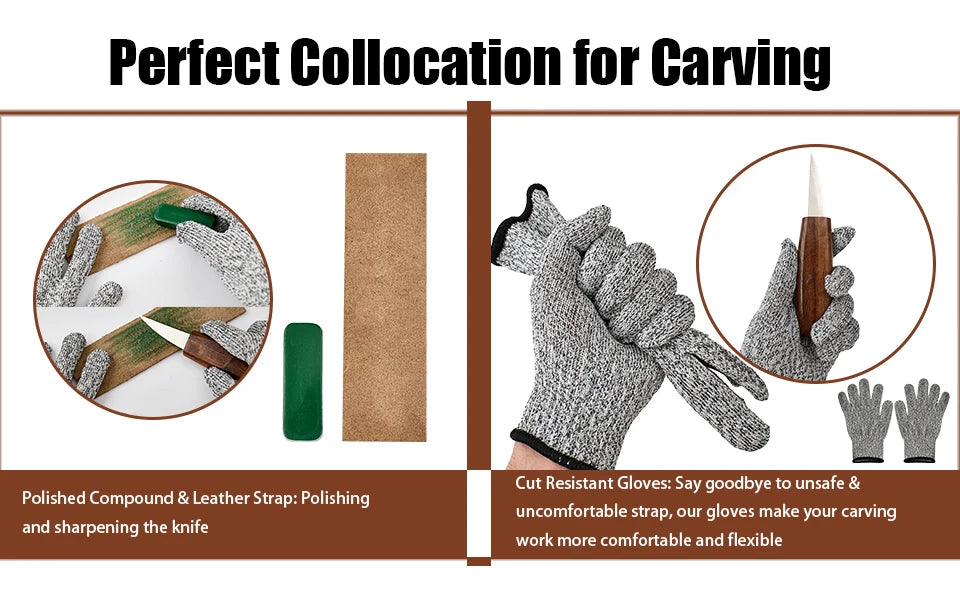 WOOD CARVING SET: The whittling kit set includes 6 wood carving knives. A pair of non-slip and wear-resistant gloves, a sharpening leather, a whetstone, and a tool bag.