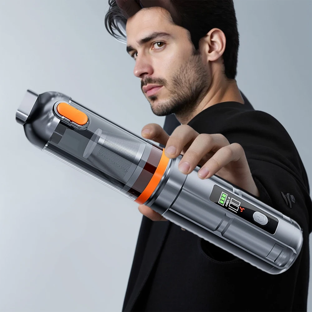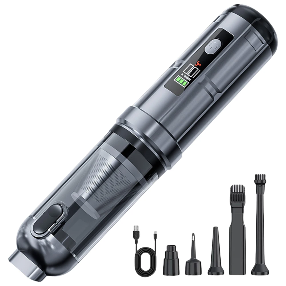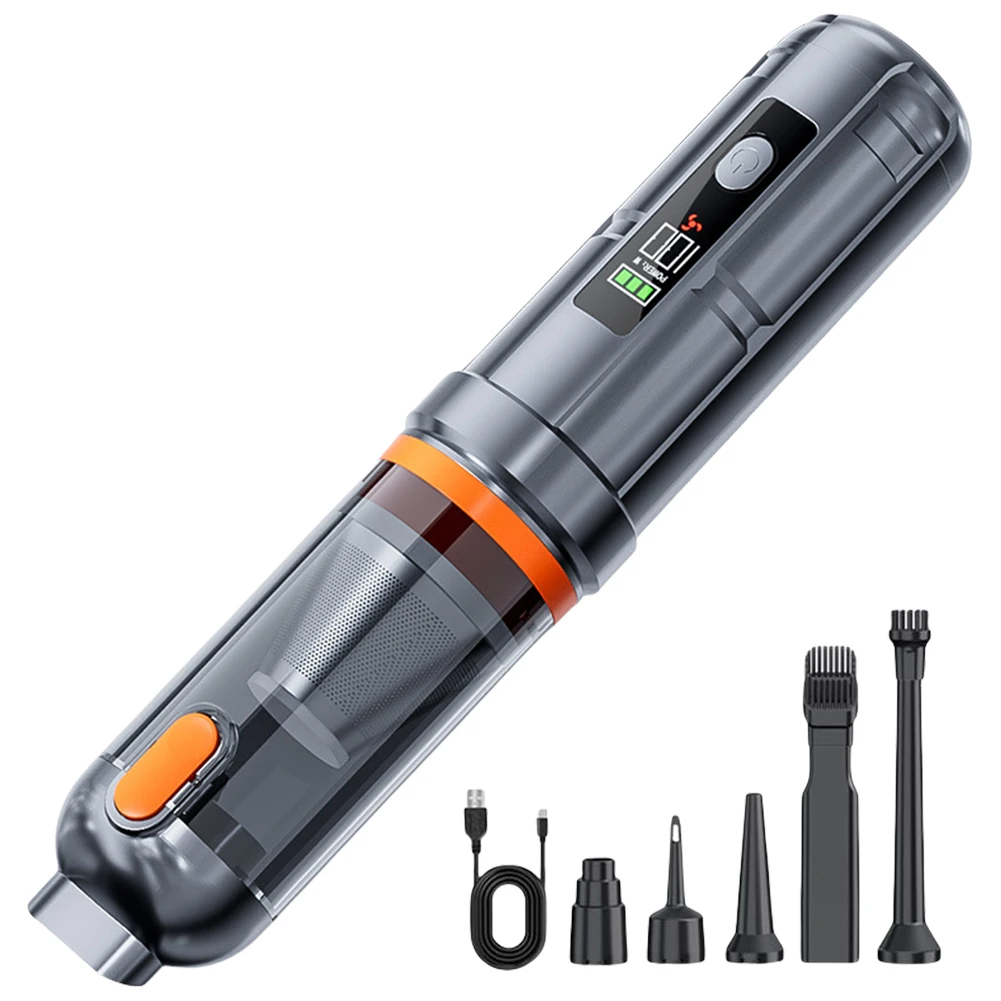 Features: 1.Strong Suction Handheld Vacuum: Our car vacuum cleaner features a high-speed DC motor and innovative aluminum alloy fan blades for high power output and strong suction. Offers three modes 2.Low Noise Handheld Vacuum and Air Blower Combo: This handheld vacuum operates quietly with noise level <80dB, ensuring a low-noise cleaning experience without disturbing family or startling pets. Combining vacuuming and blowing functions, it efficiently removes surface dust or debris and blows away dust or sand from crevices and corners. Clean anywhere for comprehensive efficiency. 3.Ultra-Light Mini Portable Cordless Compressed Air Duster: Ergonomically designed for one-handed use, this portable cordless compressed air duster cleans every corner easily and is free from cord tangles for more efficient cleaning. Compact size makes it easy to carry and store, saving space. A 0.15L trash bin capacity fully meets your daily trash storage needs. 4.LED Display & Rechargeable Cordless Handheld Vacuum: Equipped with a LED display, the handheld vacuum displays current battery level when turned on. Takes about 4-5 hours to fully charge. Once charged, mode 1 runs for 30 minutes, mode 2 for 18 minutes, and mode 3 for 12 minutes. 5.One-Key Emptying for Easy Cleaning: This high power mini vacuum cleaner features a one-key empty mechanism, allowing you to quickly dispose of dust with a press of a button. The transparent design lets you clearly see the dust collection process, reminding you to empty it in time. The built-in flip cover in the nozzle ensures dust doesn't spill when not in use. Specification: Origin: Mainland China Material: ABS Dimensions: 28.5*6*6cm Charging Indicator: Three green bars Switch Mode 1: Green, Orange, Red Switch Mode 2: Power 35W, 75W, 100W Battery Indicator: Three green bars Battery Life: Approximately 30 minutes on low setting, approximately 18 minutes on medium setting, and approximately 12 minutes on high setting Rated Voltage: 11.1V Motor Power: 100W (maximum) Motor Speed: 80,000 RPM Air Volume: 680L/min (maximum) Connector: TYPC-C Vacuum Level: High (15,000 Pa), Medium (12,000 Pa), Low (6,000 Pa) Input Voltage: Type-C 5V, 1.5A Lithium Battery Capacity: 3 x 2000mAh (18650) Charging Time: Approximately 3-3.5 hours Operating Temperature: -10°C to 50°C