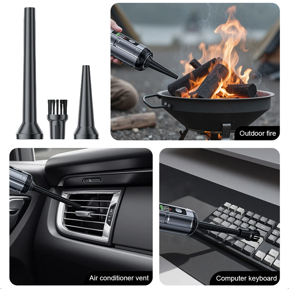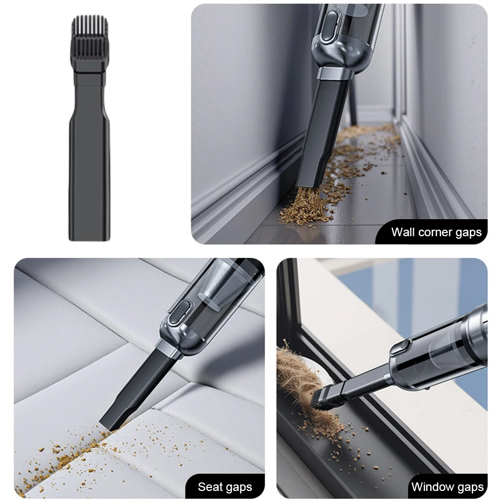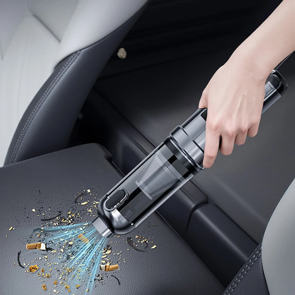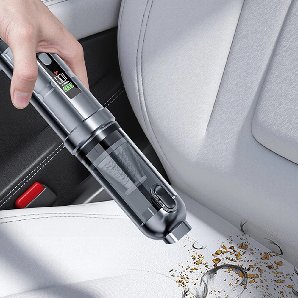 Features: 1.Strong Suction Handheld Vacuum: Our car vacuum cleaner features a high-speed DC motor and innovative aluminum alloy fan blades for high power output and strong suction. Offers three modes 2.Low Noise Handheld Vacuum and Air Blower Combo: This handheld vacuum operates quietly with noise level <80dB, ensuring a low-noise cleaning experience without disturbing family or startling pets. Combining vacuuming and blowing functions, it efficiently removes surface dust or debris and blows away dust or sand from crevices and corners. Clean anywhere for comprehensive efficiency. 3.Ultra-Light Mini Portable Cordless Compressed Air Duster: Ergonomically designed for one-handed use, this portable cordless compressed air duster cleans every corner easily and is free from cord tangles for more efficient cleaning. Compact size makes it easy to carry and store, saving space. A 0.15L trash bin capacity fully meets your daily trash storage needs. 4.LED Display & Rechargeable Cordless Handheld Vacuum: Equipped with a LED display, the handheld vacuum displays current battery level when turned on. Takes about 4-5 hours to fully charge. Once charged, mode 1 runs for 30 minutes, mode 2 for 18 minutes, and mode 3 for 12 minutes. 5.One-Key Emptying for Easy Cleaning: This high power mini vacuum cleaner features a one-key empty mechanism, allowing you to quickly dispose of dust with a press of a button. The transparent design lets you clearly see the dust collection process, reminding you to empty it in time. The built-in flip cover in the nozzle ensures dust doesn't spill when not in use. Specification: Origin: Mainland China Material: ABS Dimensions: 28.5*6*6cm Charging Indicator: Three green bars Switch Mode 1: Green, Orange, Red Switch Mode 2: Power 35W, 75W, 100W Battery Indicator: Three green bars Battery Life: Approximately 30 minutes on low setting, approximately 18 minutes on medium setting, and approximately 12 minutes on high setting Rated Voltage: 11.1V Motor Power: 100W (maximum) Motor Speed: 80,000 RPM Air Volume: 680L/min (maximum) Connector: TYPC-C Vacuum Level: High (15,000 Pa), Medium (12,000 Pa), Low (6,000 Pa) Input Voltage: Type-C 5V, 1.5A Lithium Battery Capacity: 3 x 2000mAh (18650) Charging Time: Approximately 3-3.5 hours Operating Temperature: -10°C to 50°C