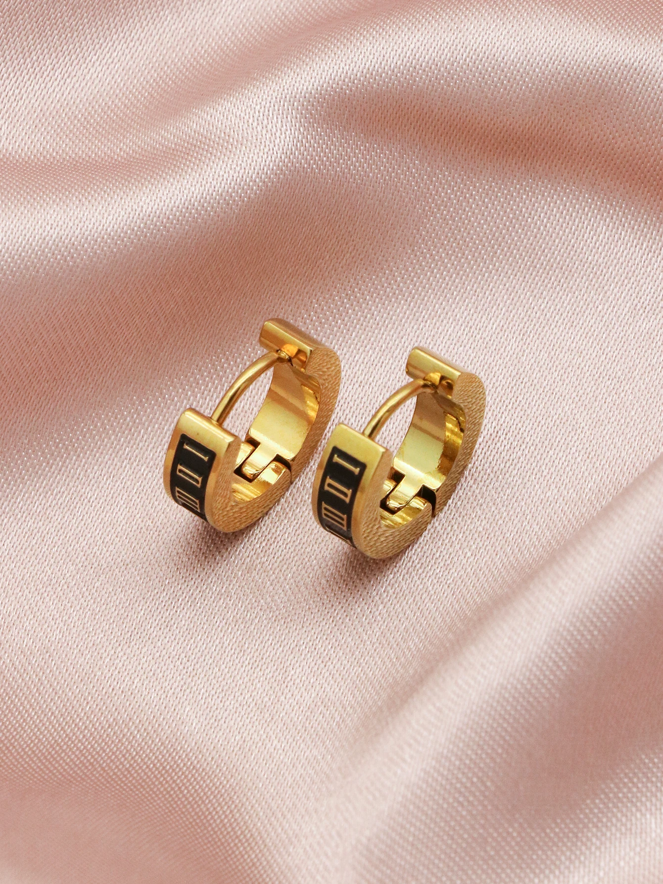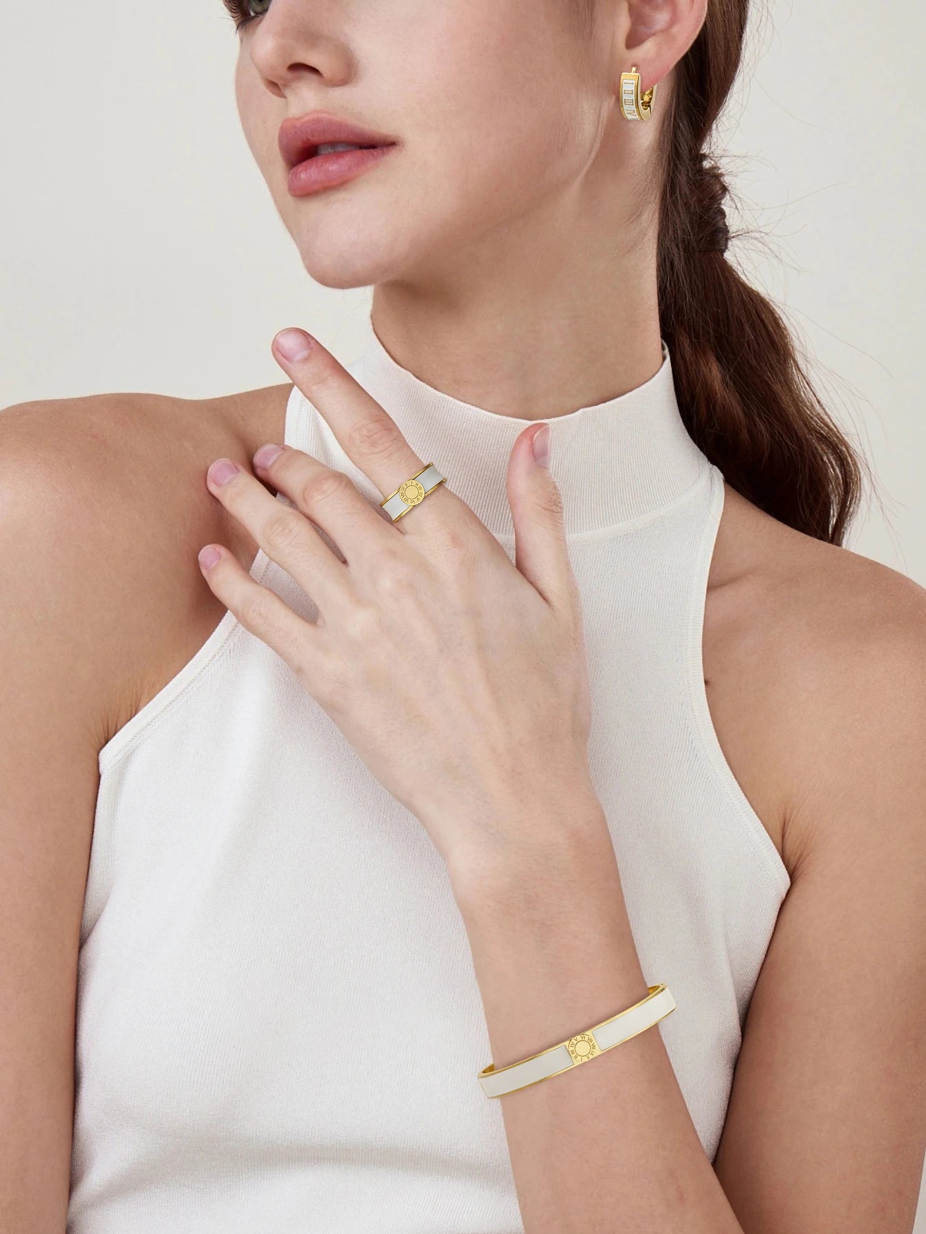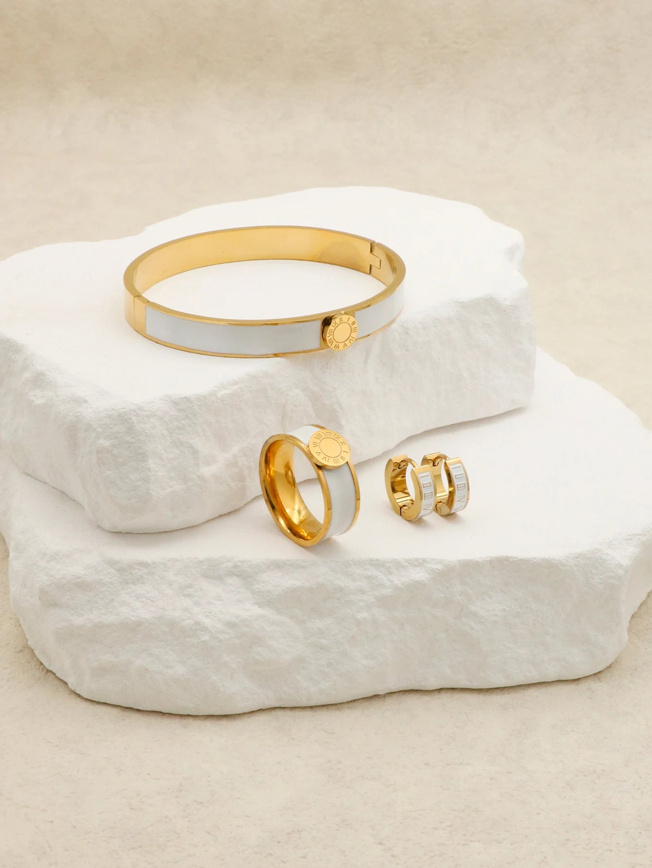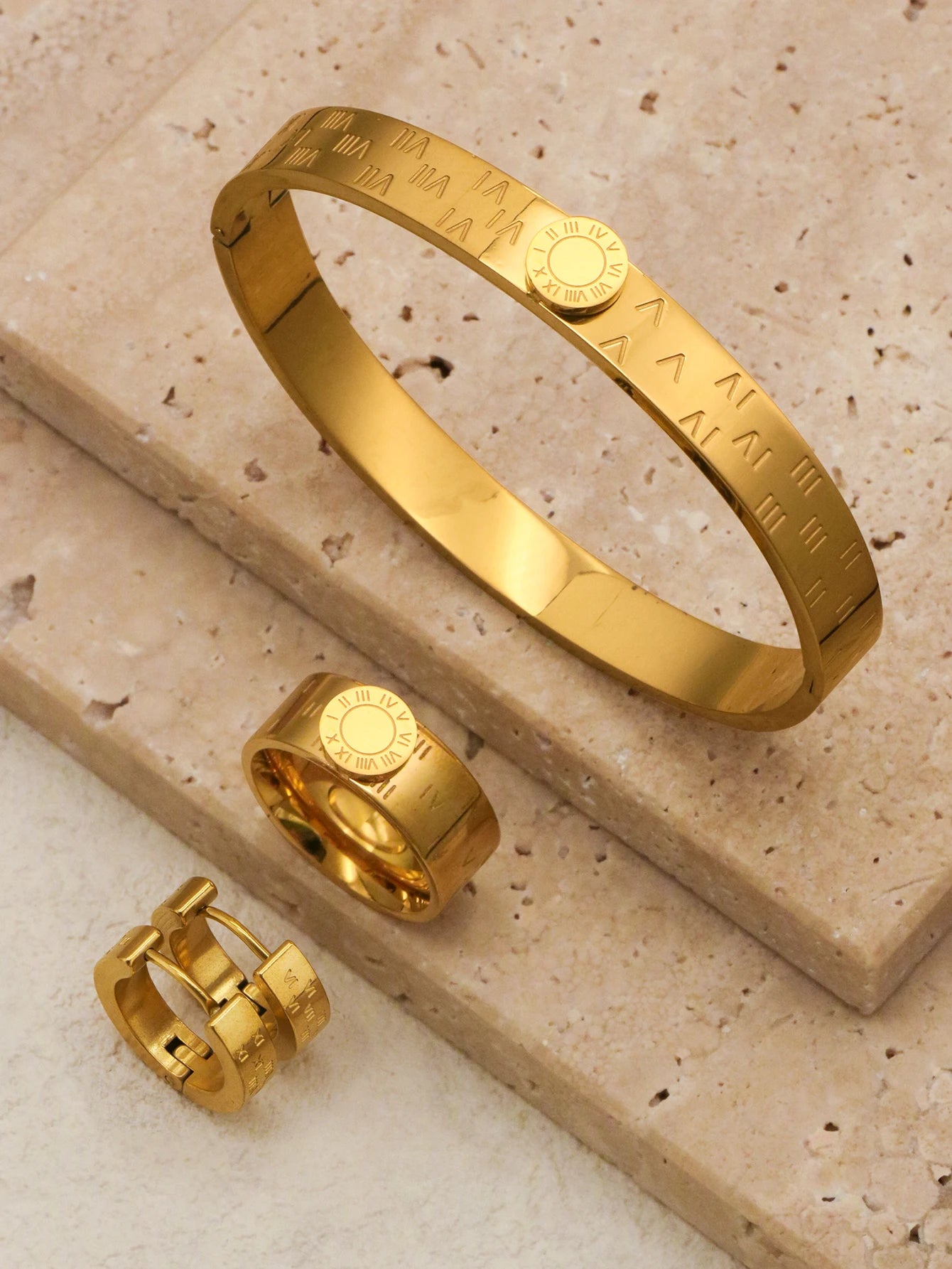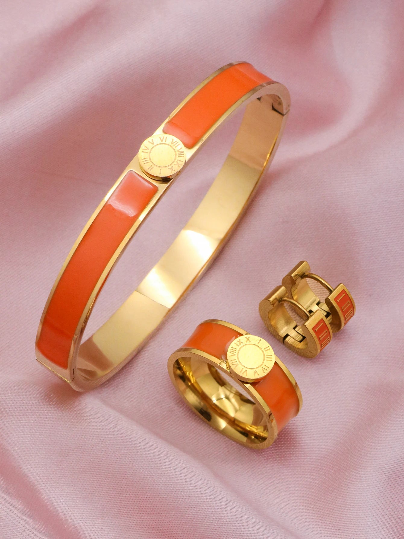 1set/4pcs New Trendy Round Roman Numerals Bracelet Stainless Steel Enamel Bangles Ring Earrings Jewelry Set Women Orange Color