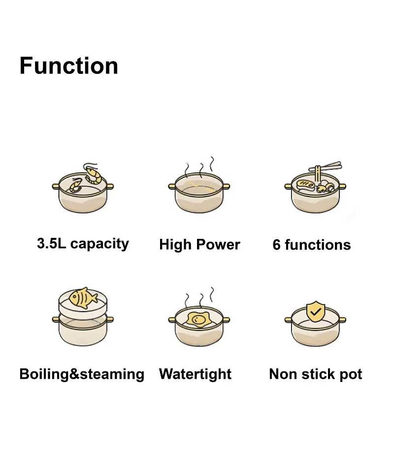 Function: Rice/Grains,steam,Stew Soup,Stew,Fry,Keep Warm,Reheat,Anti-dry burning