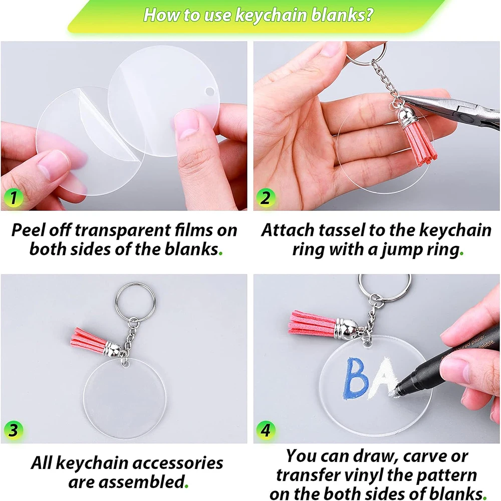 200Pcs Acrylic Keychain Blanks Bulk with 5 Shapes Clear Acrylic Disc Leather Tassel Charms Key Chains Jump Ring for DIY Craft
