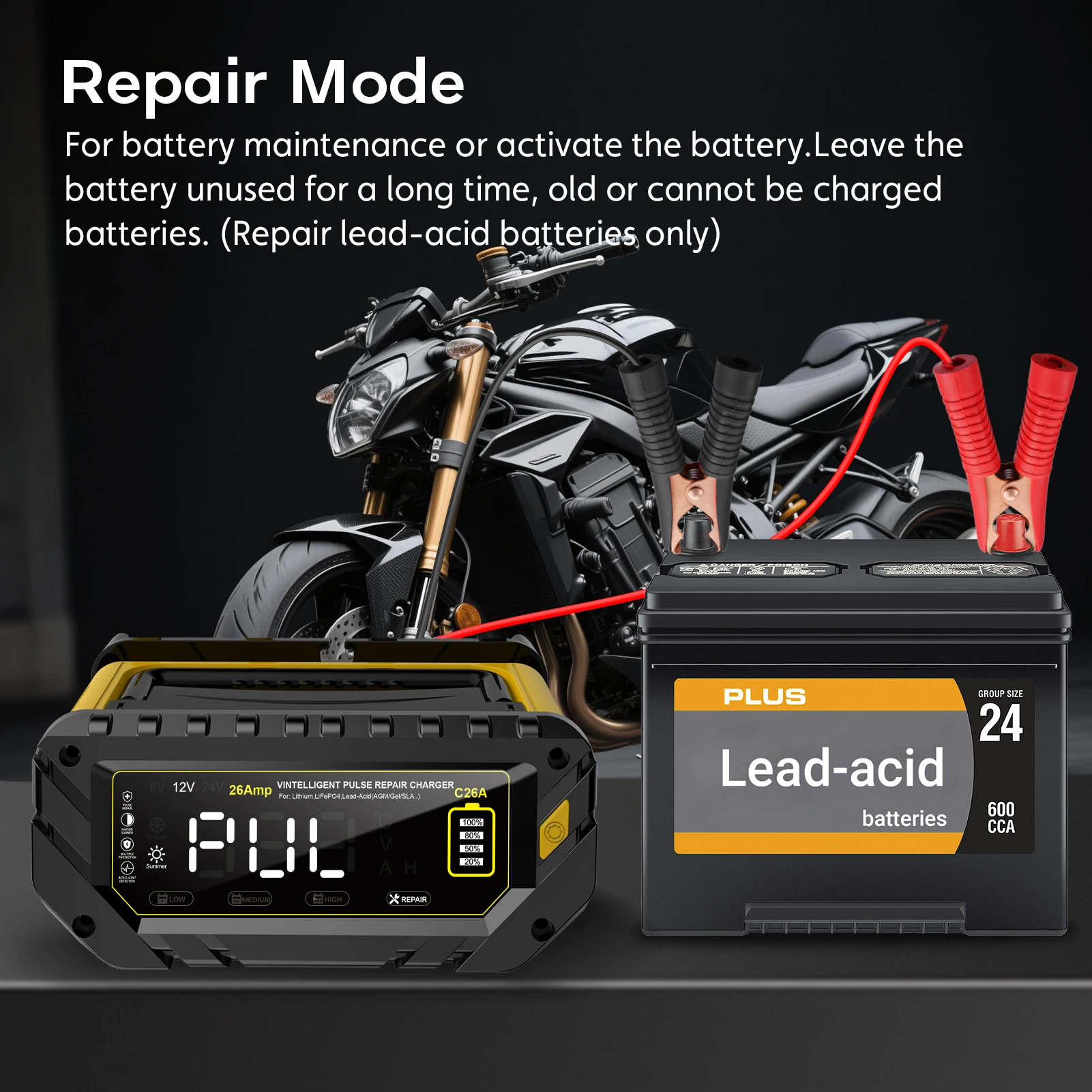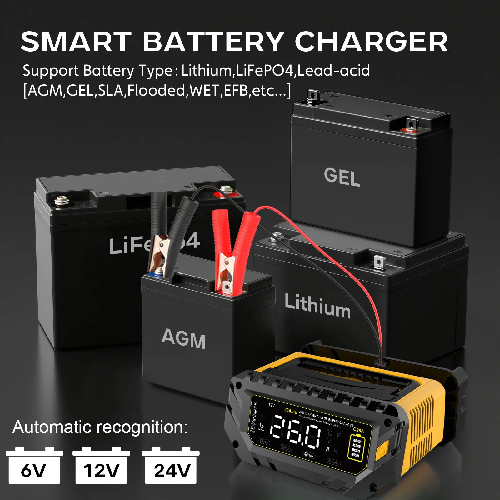 2025 26A Car Battery Charger 6V/12V/24V LiFePO4 Car Charger for Lithium AGM GEL Lead-Acid Battery Charger for Car Motorcycle