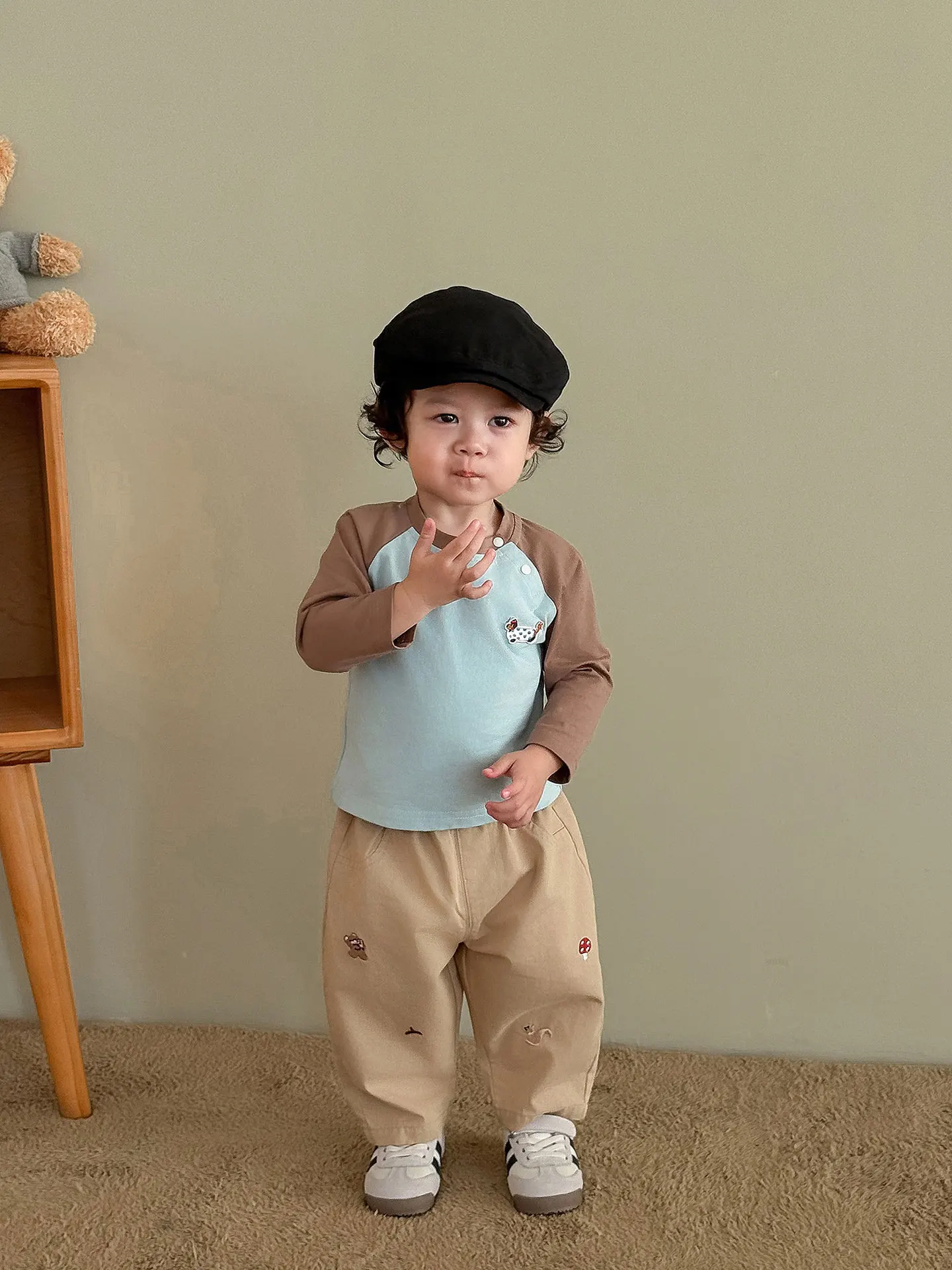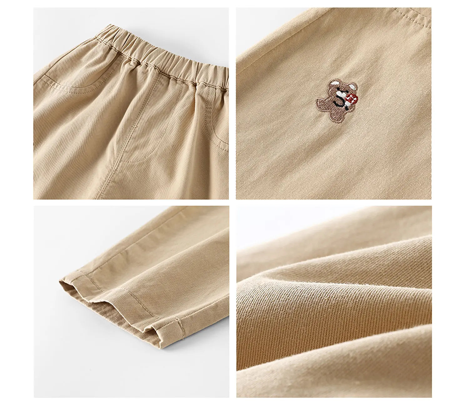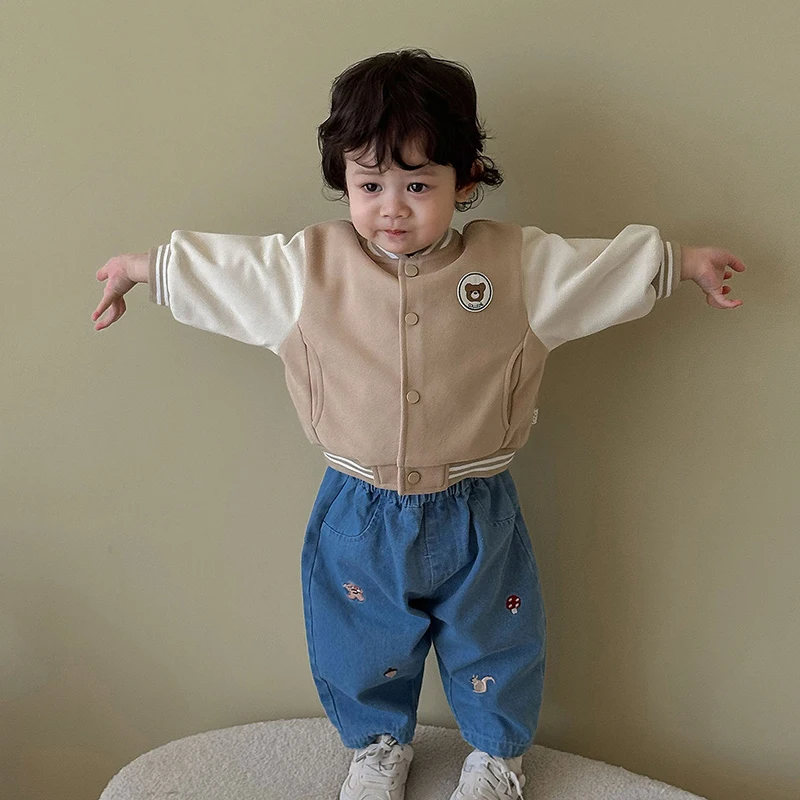 Features cute cartoon embroidery (bear, mushroom, squirrel, acorn), adding a fashionable and whimsical touch that appeals to kids and parents.