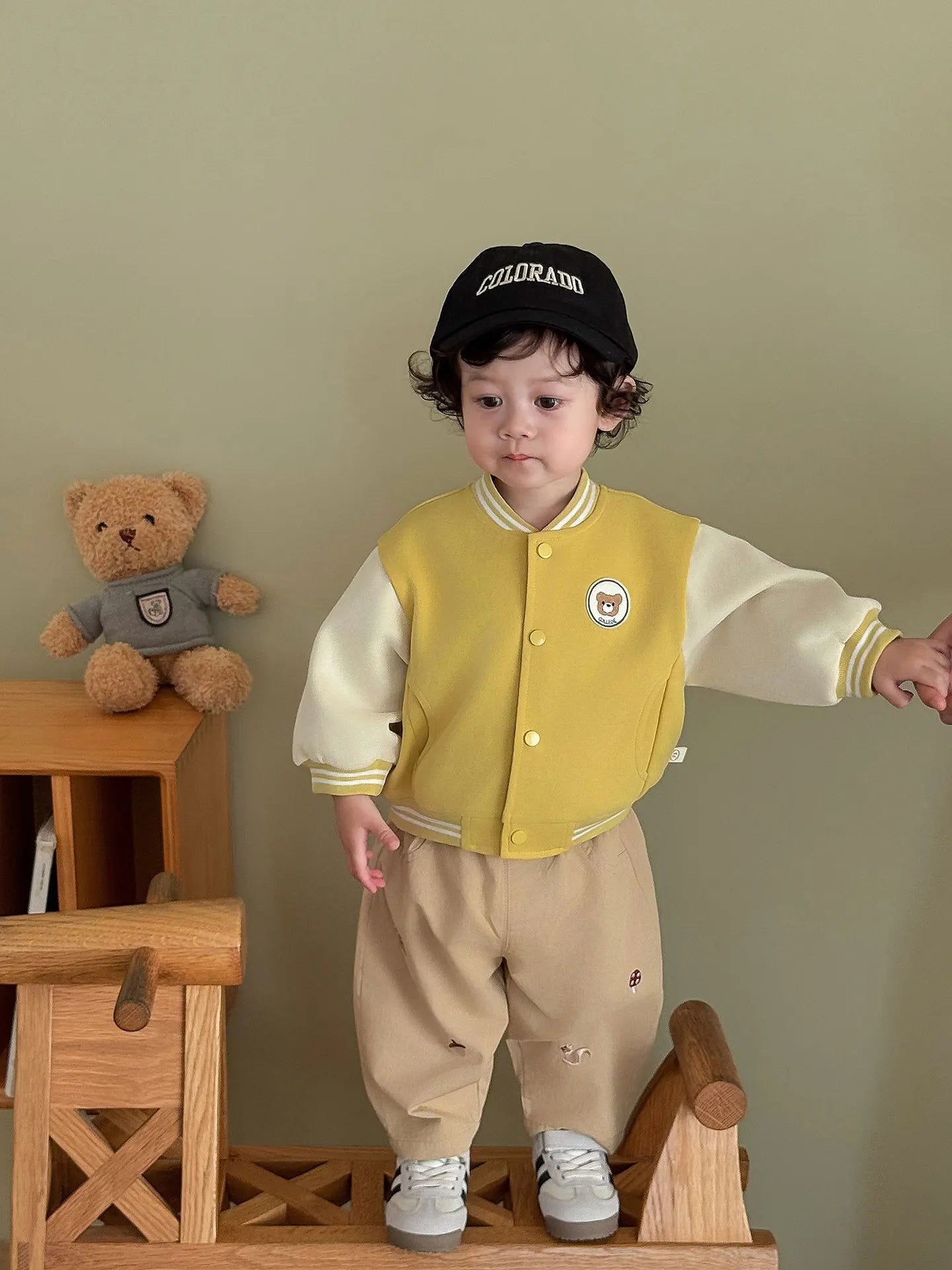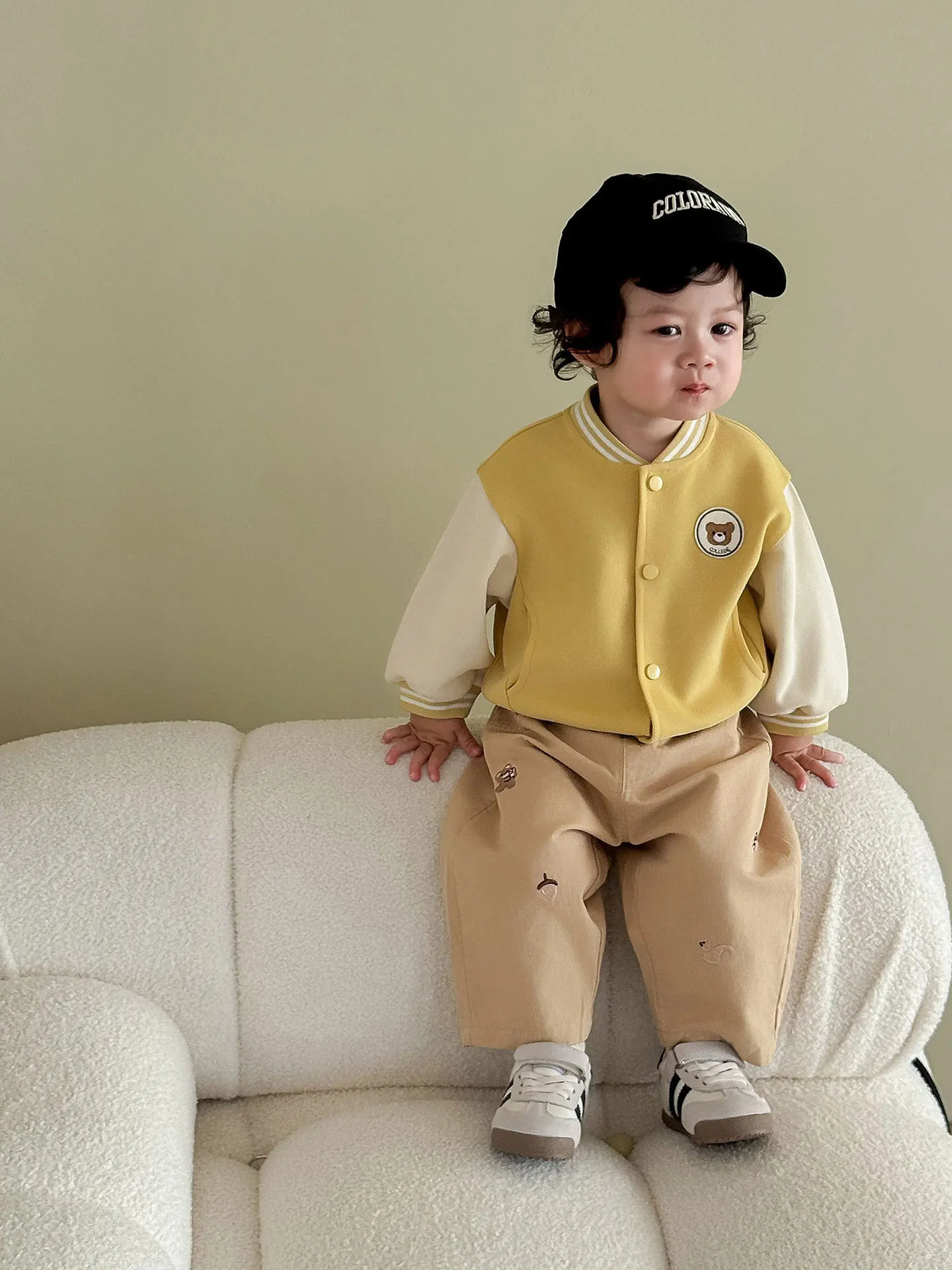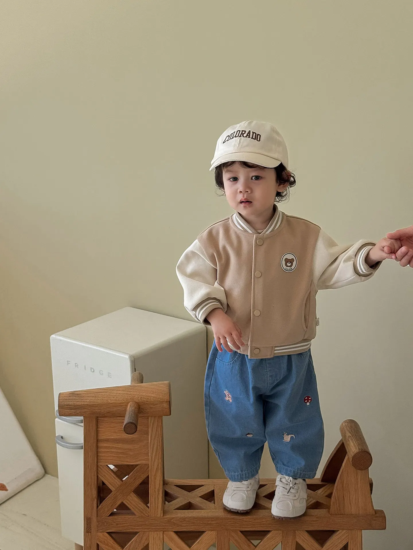 Features cute cartoon embroidery (bear, mushroom, squirrel, acorn), adding a fashionable and whimsical touch that appeals to kids and parents.