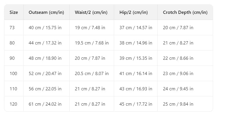 Pants Size Reference Chart