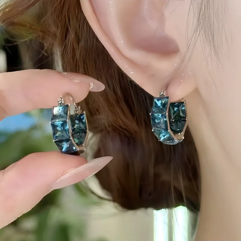 2025 Korean new design fashion jewelry luxury square blue crystal hoop earrings elegant women's daily work accessories