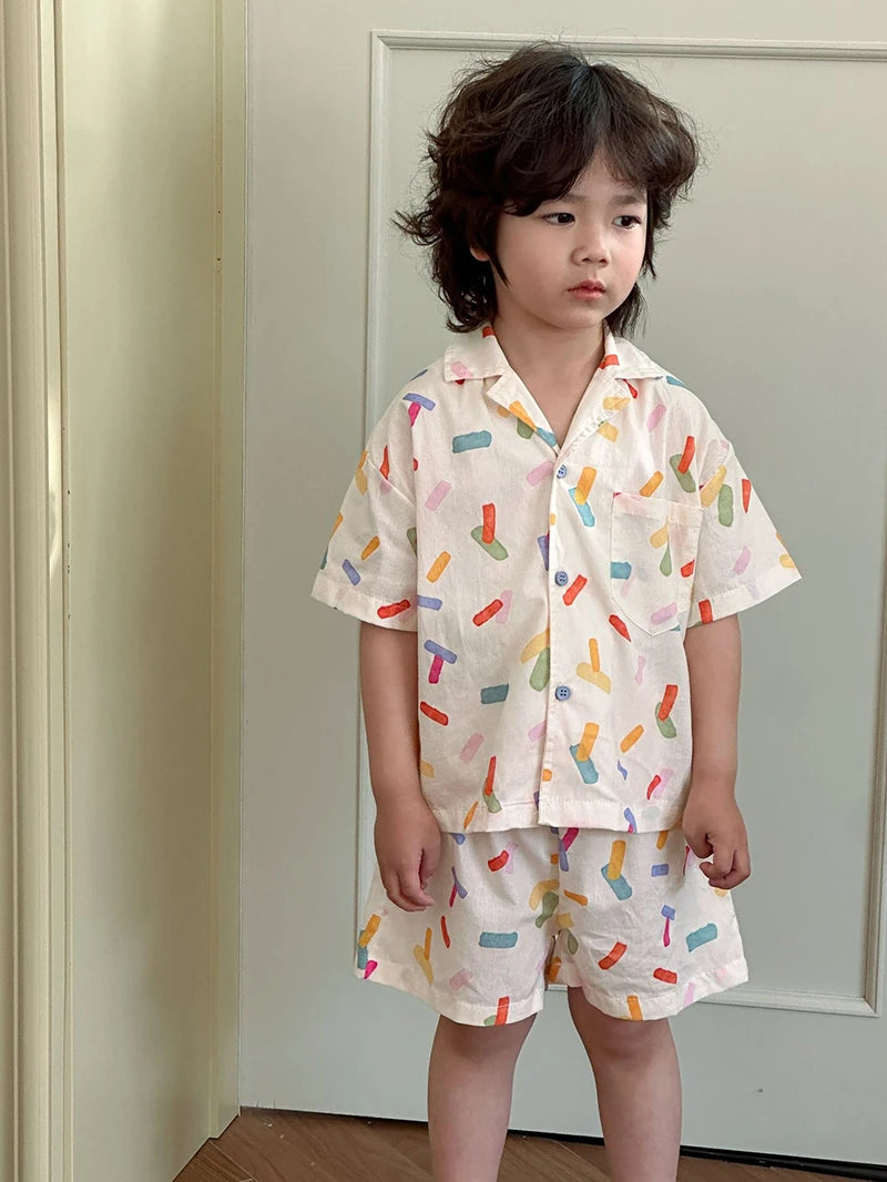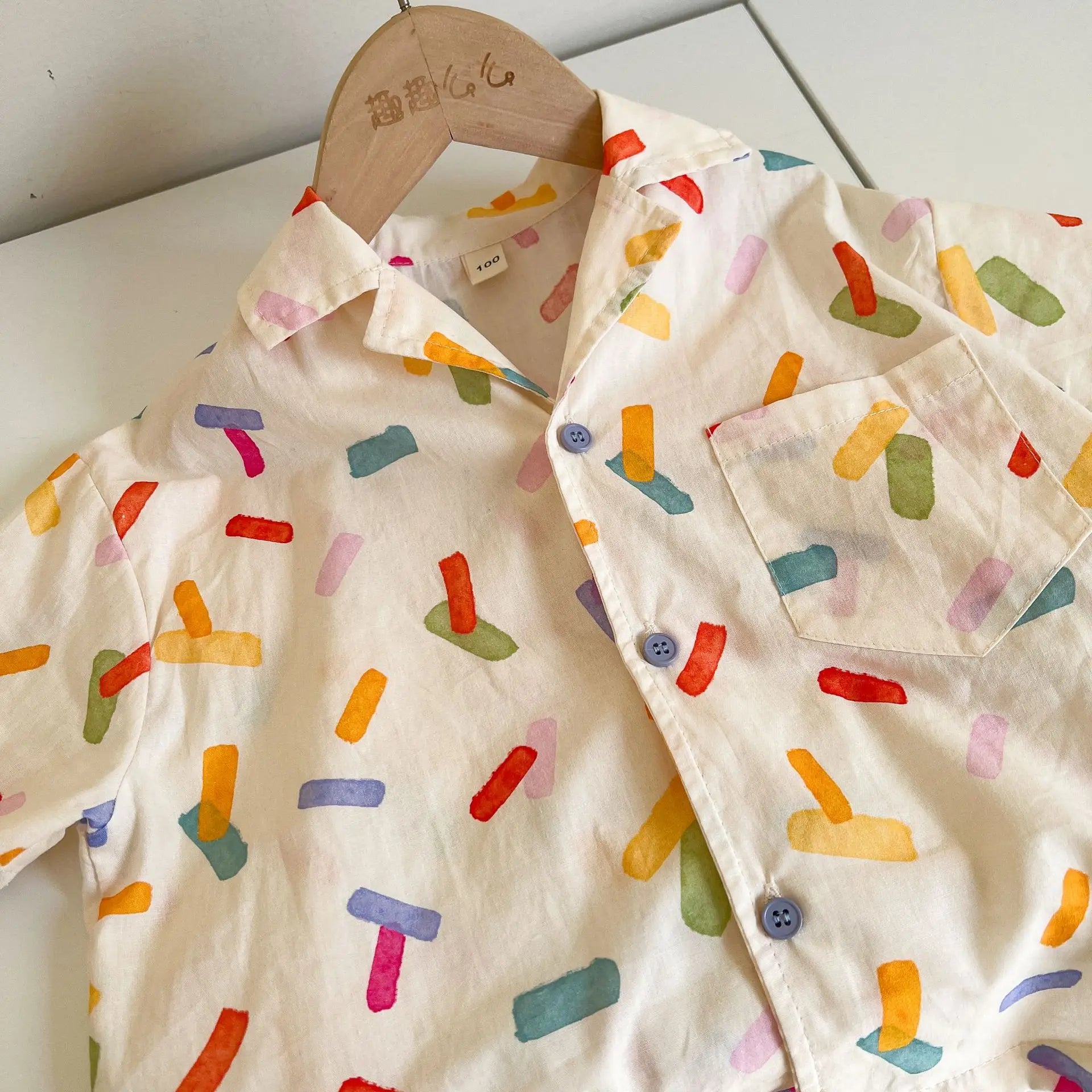 The vibrant, colorful bar - shaped patterns add a playful and lovely touch, making your kids look stylish and adorable. The girl's dress features a turn - down collar and button - up design for easy dressing and undressing, while the boy's set has a pocket for added functionality.