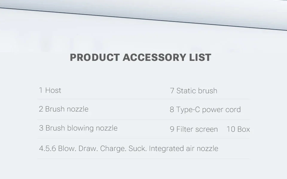 2.5 Accessories Brush, static brush, flat tube, long blowing rod, long rod brush, USB charging cable, (three inflatable accessories) (optional: HEPA, simple open cover dust cup, bag)