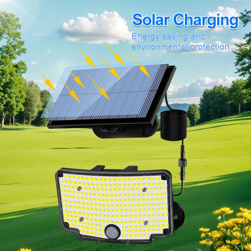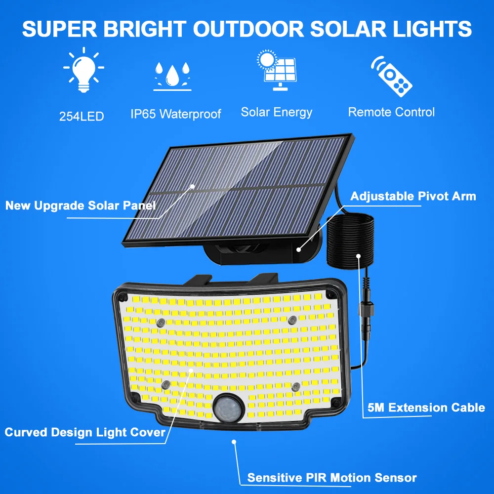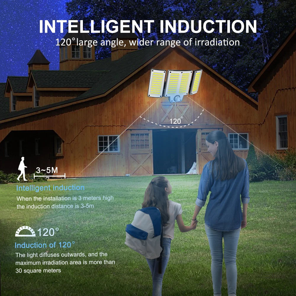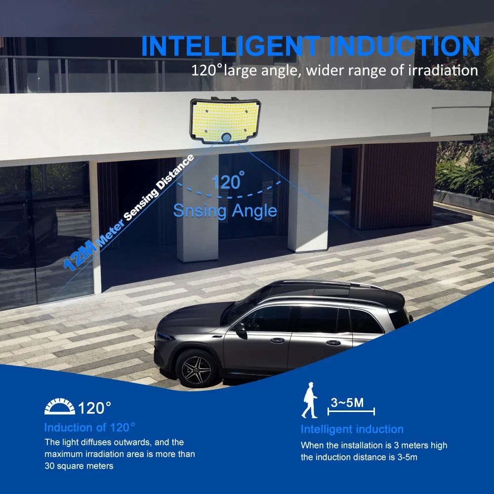 【254LEDs & Wide-Angle Illumination:Equipped with 254 high-efficiency LED beads, this solar security light delivers bright, cool-white illumination with a wide vertical 180° and horizontal 180° coverage. Perfect for lighting up driveways, gardens, and pathways, ensuring enhanced visibility and safety throughout the night.