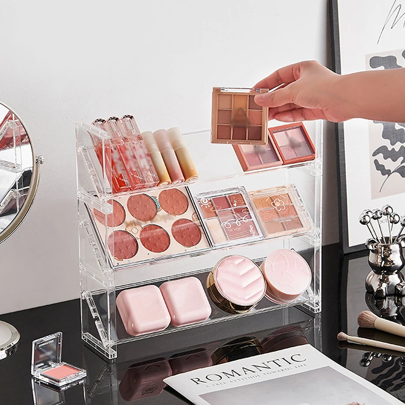 3-Layer Acrylic Cosmetics Rack: Eyeshadow/Blush Tray + Desktop Sundries/Toys Organizer
