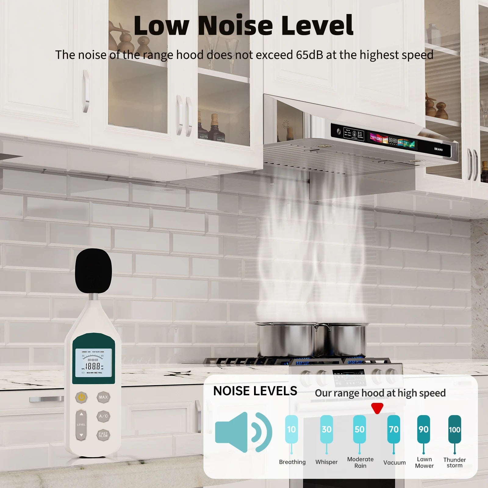 【Premium Quality Range Hood】Brano under cabinet range hood is made of durable, rust-proof brushed stainless steel. Modern design adds an elegant touch to your kitchen. The 4-speed fan, 3 control methods, 2 LED lights, 3-minute delay shutdown, and 15-minute adjustable timer offer flexible control for your cooking needs