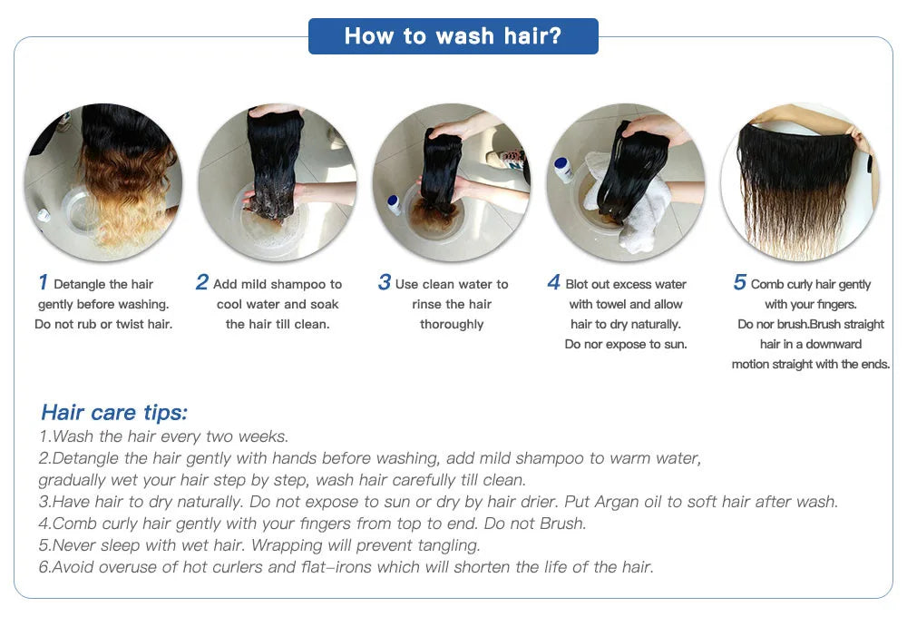 A: You can wash them as you would your own. Shampoo and conditioner. We also recommend using a hair treatment on them every few weeks, because the hair is not attached to your scalp, it is not getting the oils it should be. Using a treatment/hair mask will help keep them looking healthier and shiny for longer! You will find that you don't need to wash your extensions too much, about every 3 weeks. The extensions can be blow-dryed on low setting, but it is not recommended to do it too often. It is best to let your hair extensions dry naturally after washing them. please comb from bottom to top.