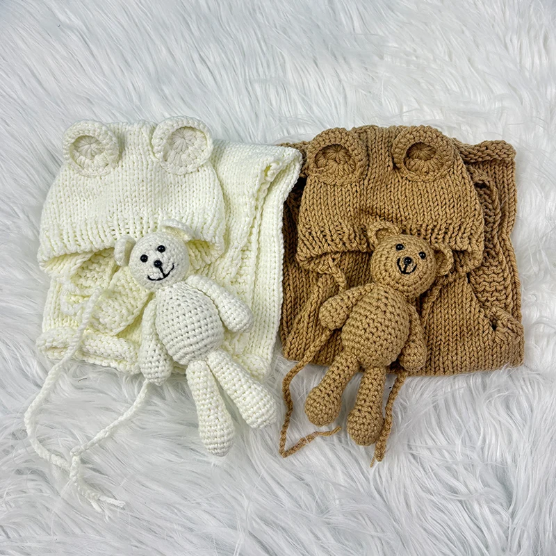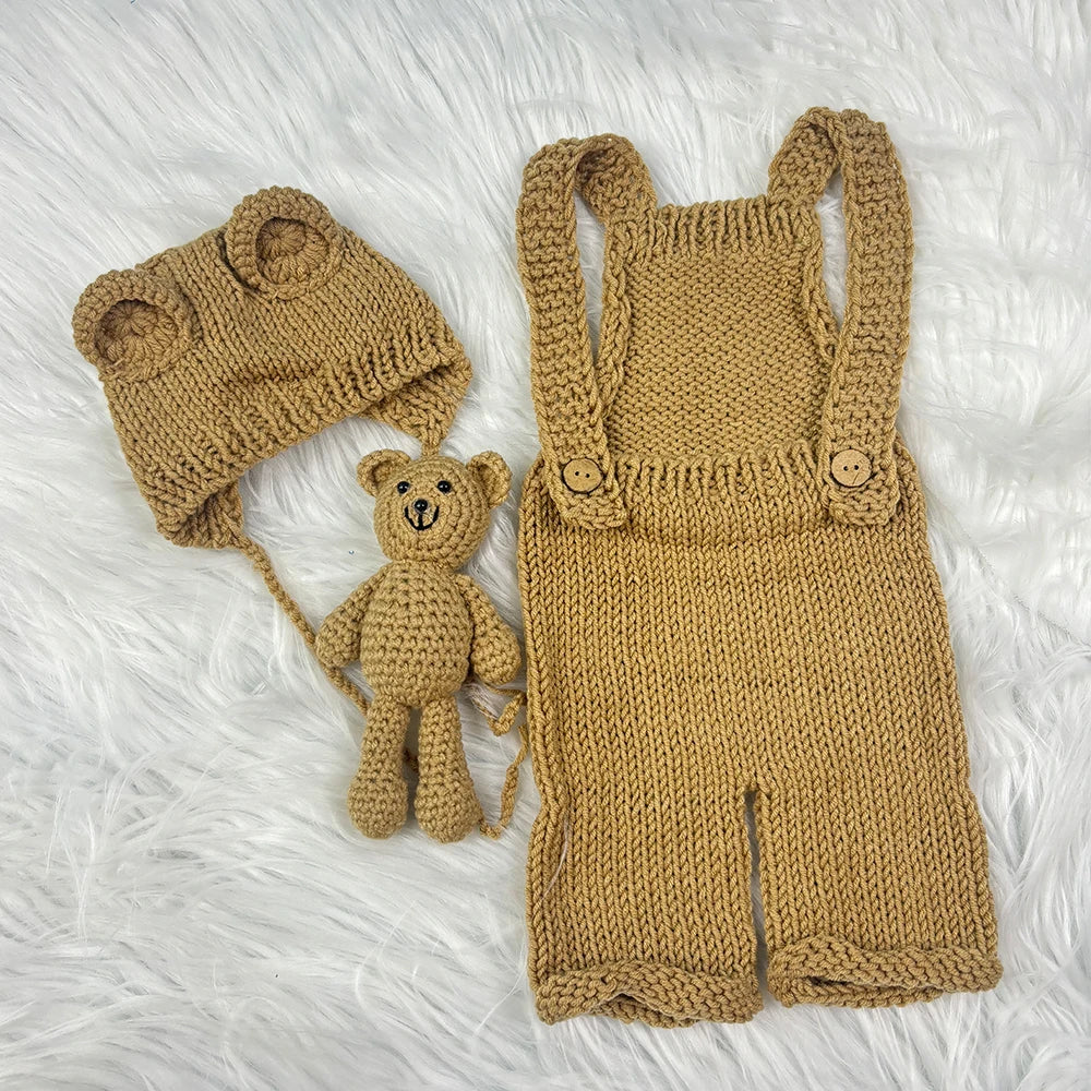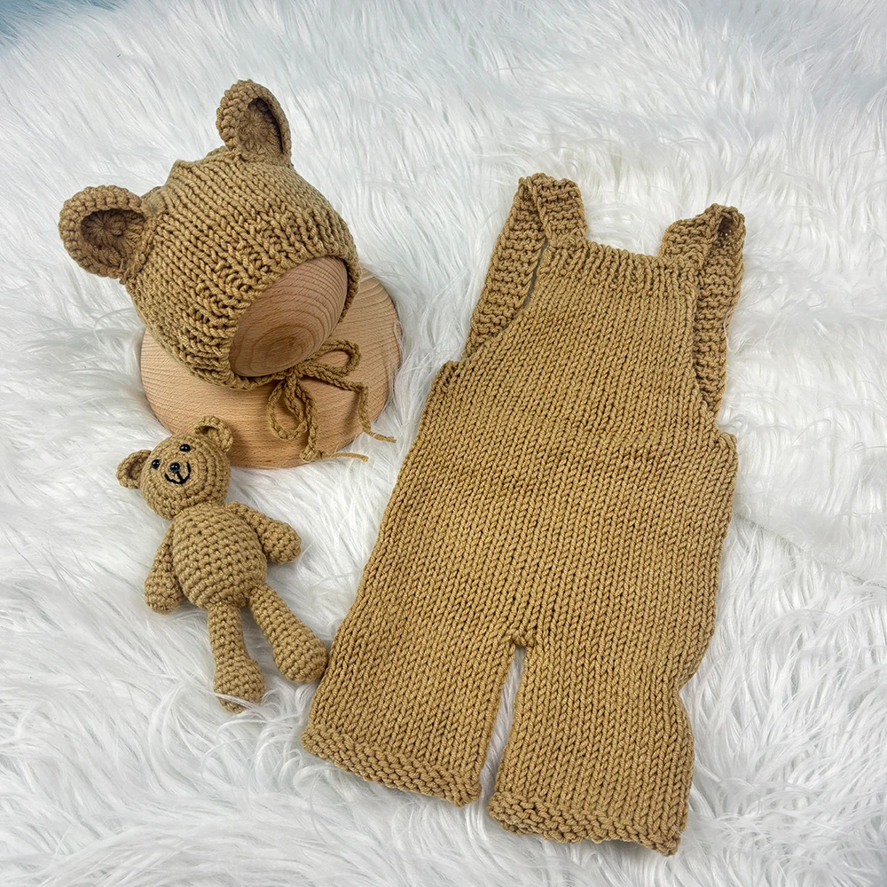 3pcs Baby Cute Costume Newborn Photography Props Crochet Knitted Bear Ear Hat, Bear Doll and Overalls Sets Studio Photos Outfits