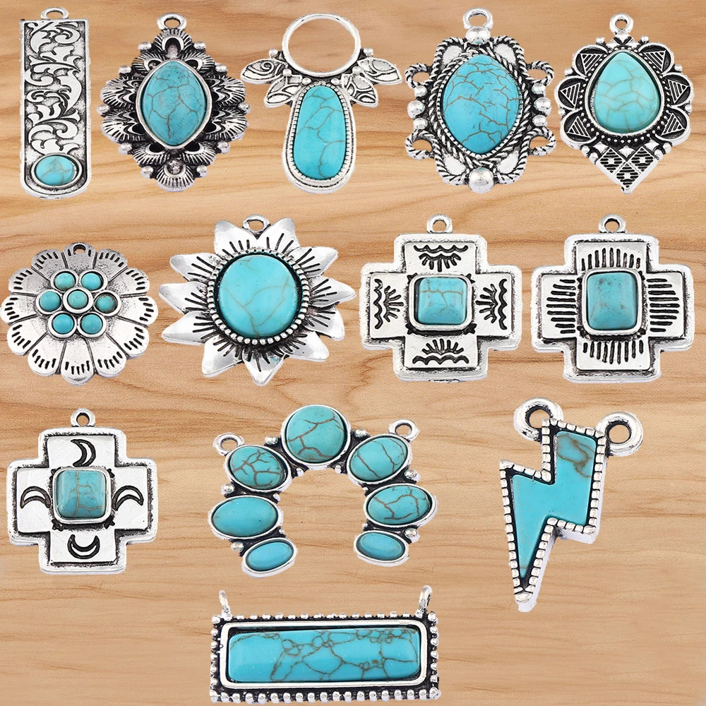 4 Pieces Tibetan Silver Color & Turquoise Crystal Hollow Charms Pendants For DIY Necklace Jewelry Making Accessories