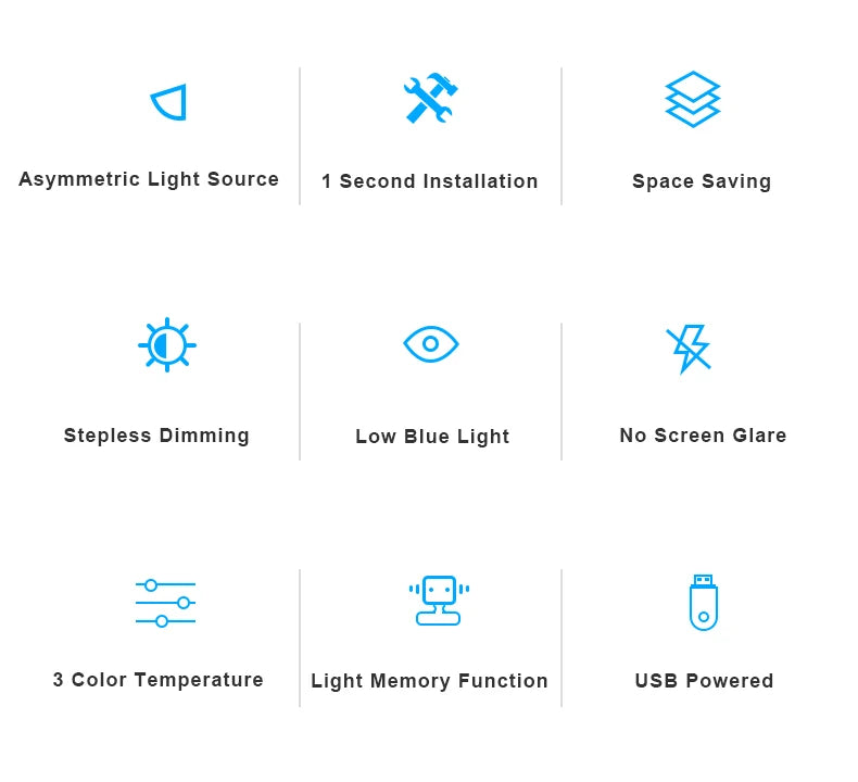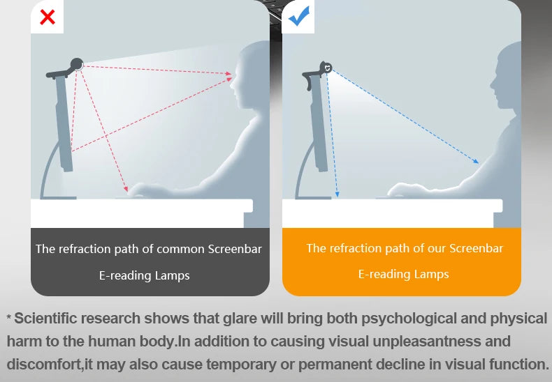 1.Computer monitor light with asymmetrical optical design, it only illuminates the desk and eliminates reflective glare off the screen, effectively protect your eyes in daily life.