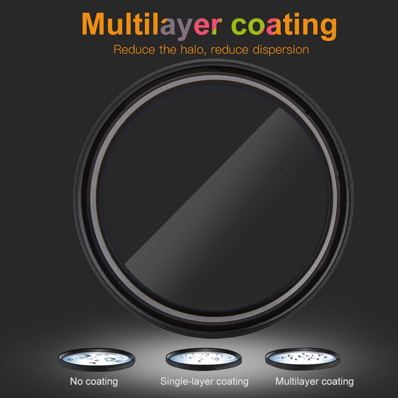 The lens adopts premium optical glass with multiple coatings, can greatly block unnecessary light to reduce halo and dispersion.