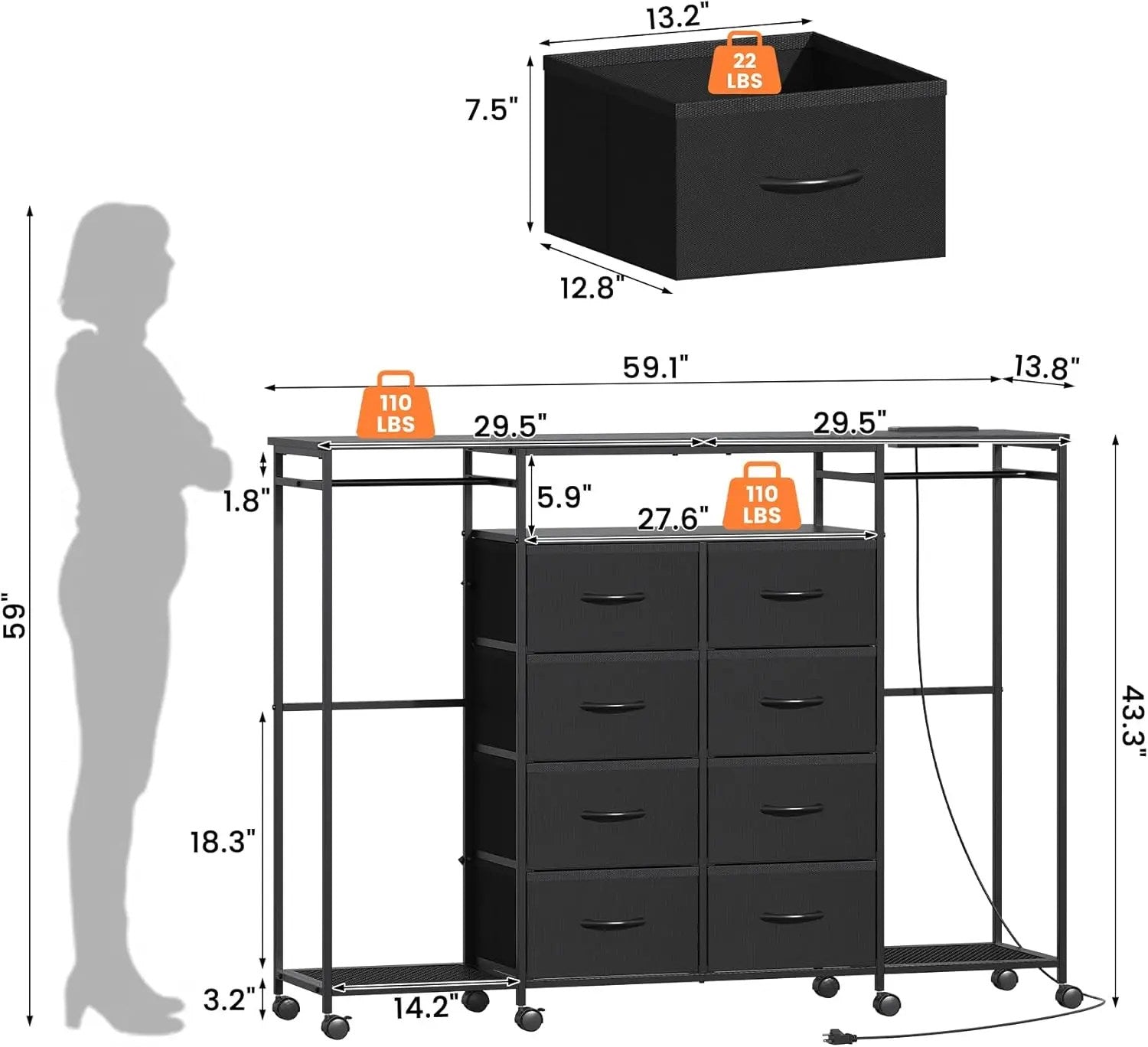 59.1" W Dresser for Bedroom with Hanging Rack, 8 Drawer Dresser with LED Lights & Charging Station, Fabric Dressers