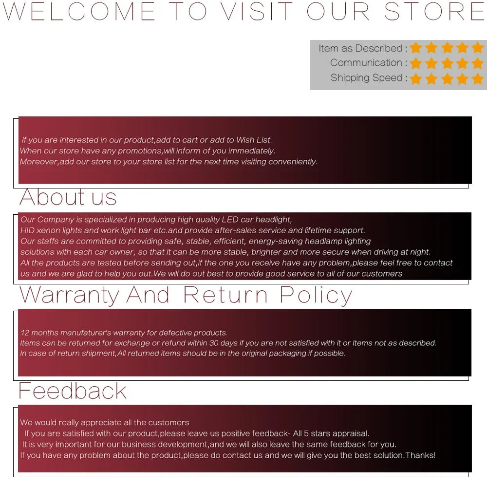 We are a professional car accessories supplier.We have our own factory and brand.We provide the high-quality led headlight,HID kits,work light bar and good services, you can buy confidence in my store.If there is any question,please contact us.