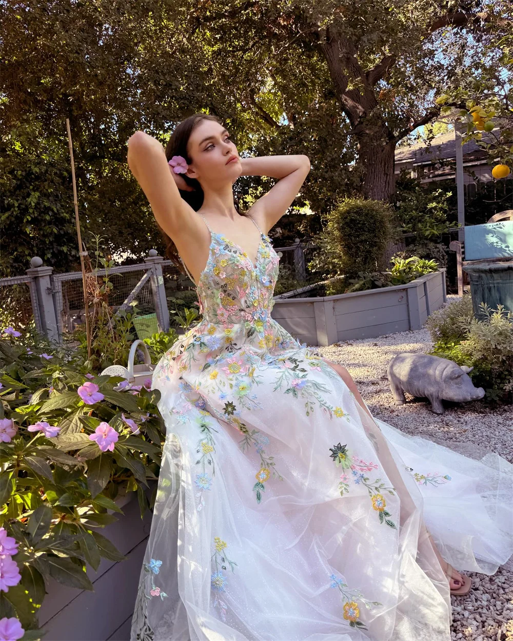 Amanda Customized Spaghetti Strap Floral Embroidery Tulle Prom Dress Side Split vestidos de noche A-Line Pleated Formal Evening