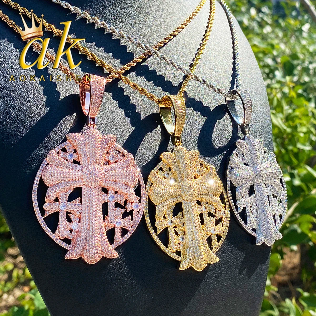 Aokaishen Iced Out Cross Disc Necklace Pendant for Women Real Gold Plated 5A Cubic Zirconia Hip Hop Jewelry