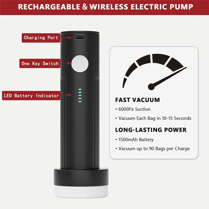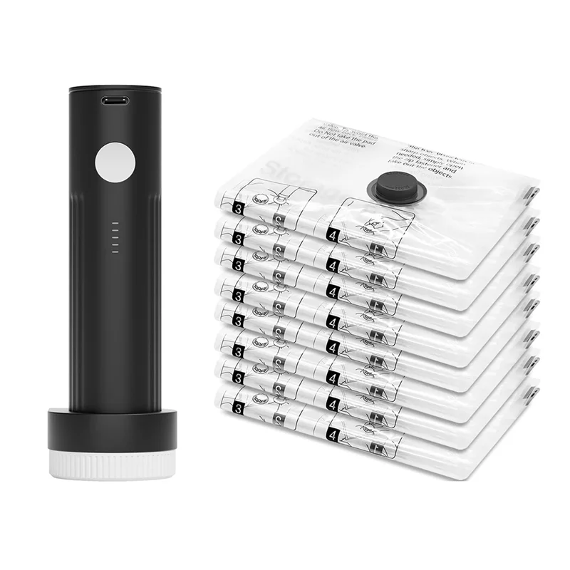 Advanced Electric Pump: Our rechargeable, wireless electric pump is a game-changer in packing efficiency. With a 1500mAh battery, it compresses up to 90 bags per charge and features a powerful 6000Pa suction, packing a bag in just 10-15 seconds.