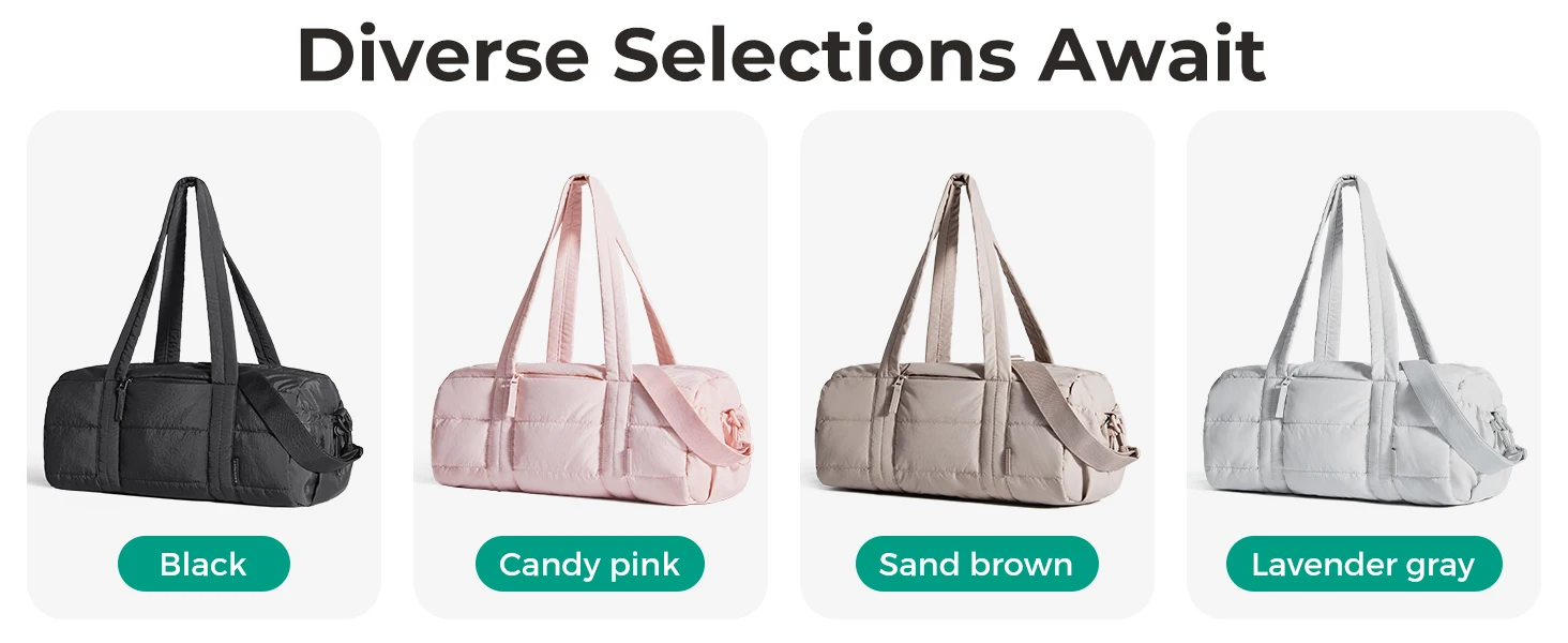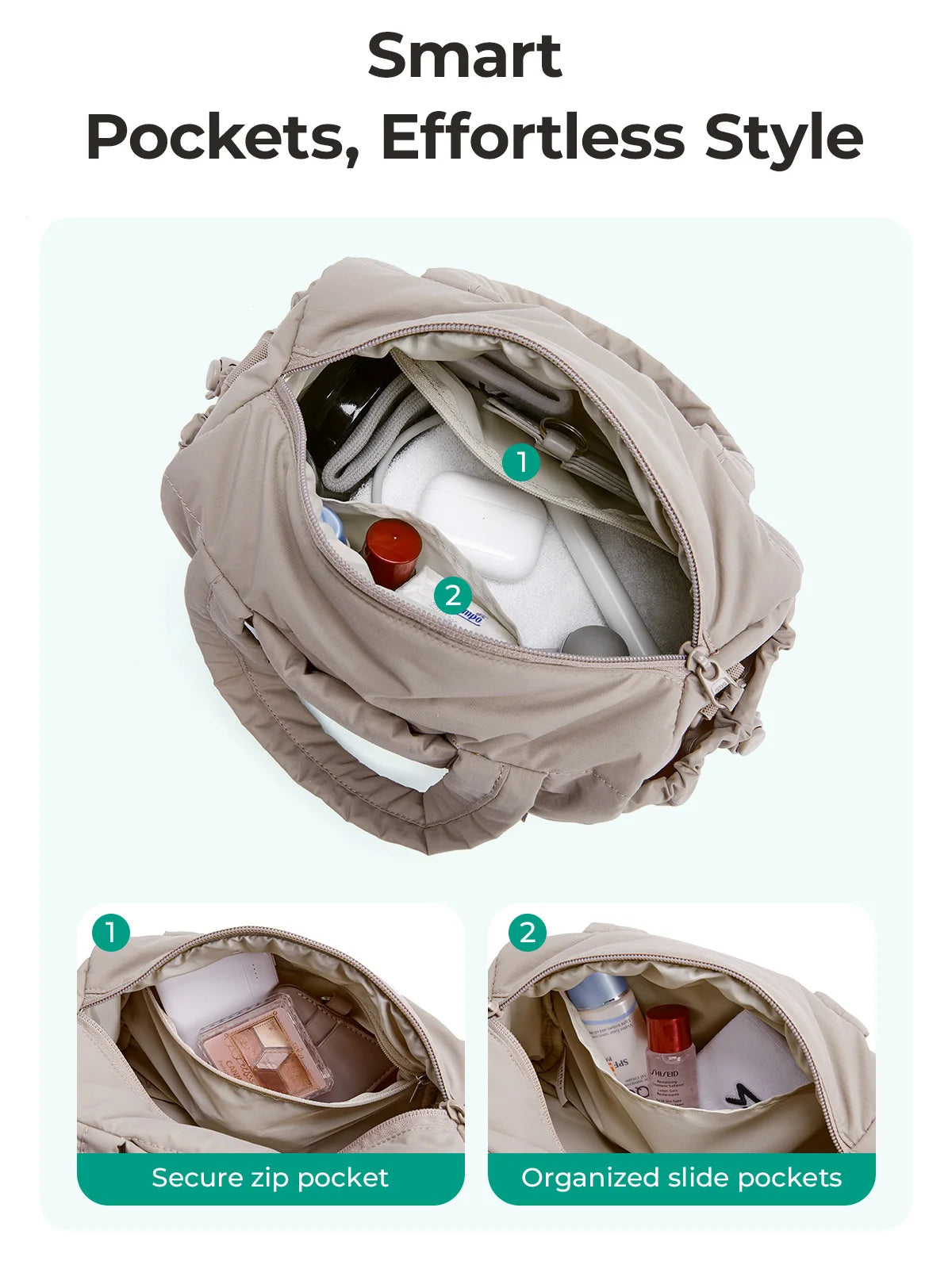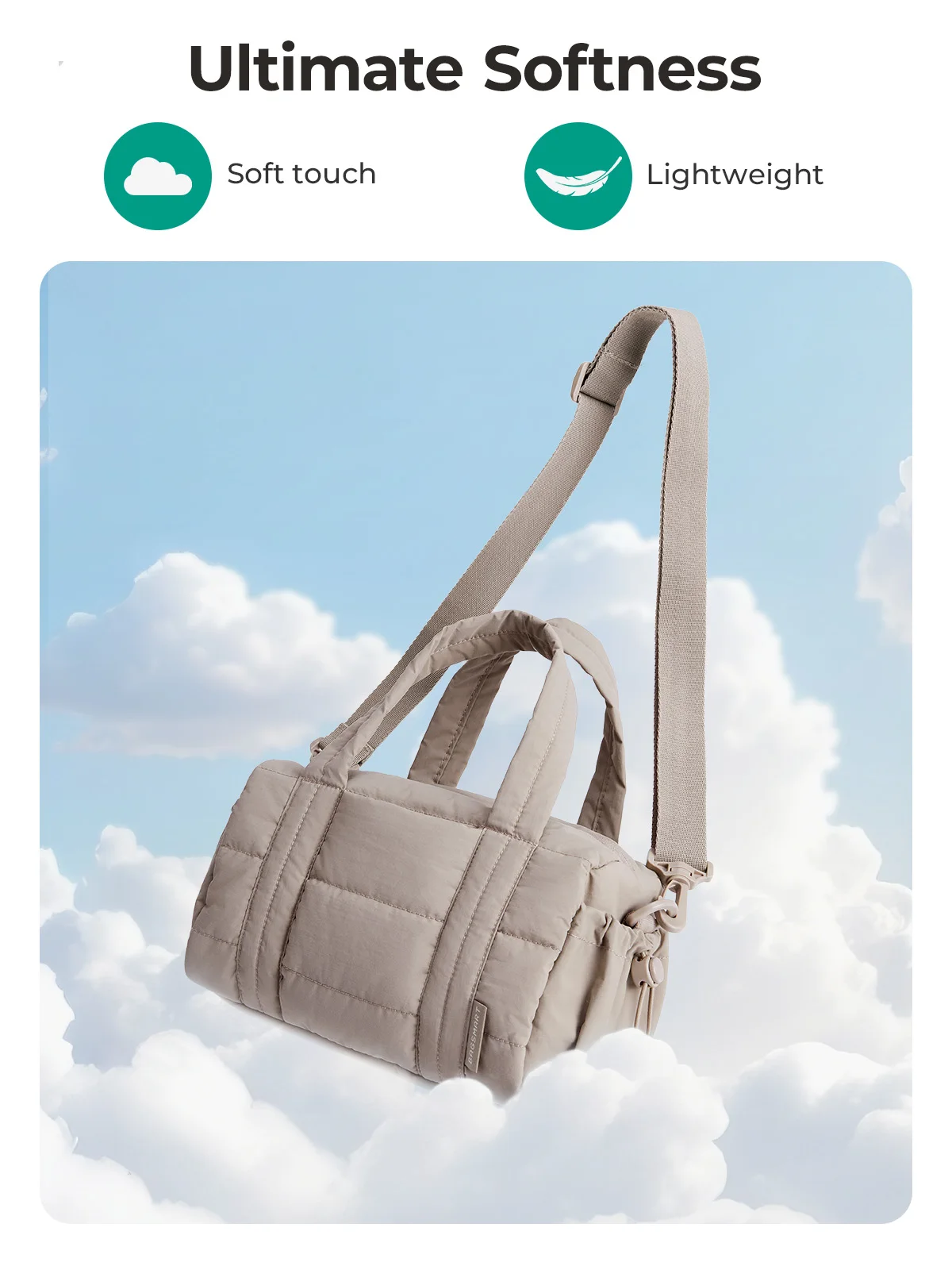 Commuting Shoulder Bag: Quick-grab side pocket on the small duffle for your phone, plus interior slots for cards and lip balm. Roomy enough for daily errands, baby essentials, or a mini makeup touch-up kit