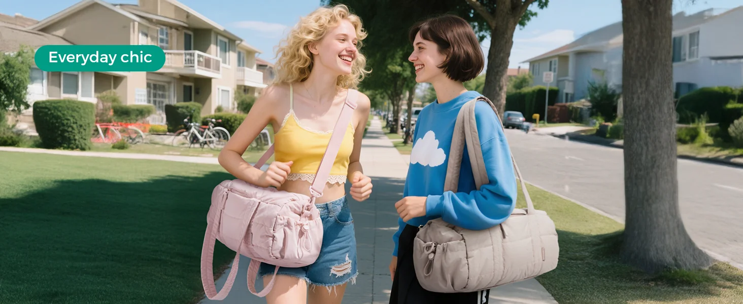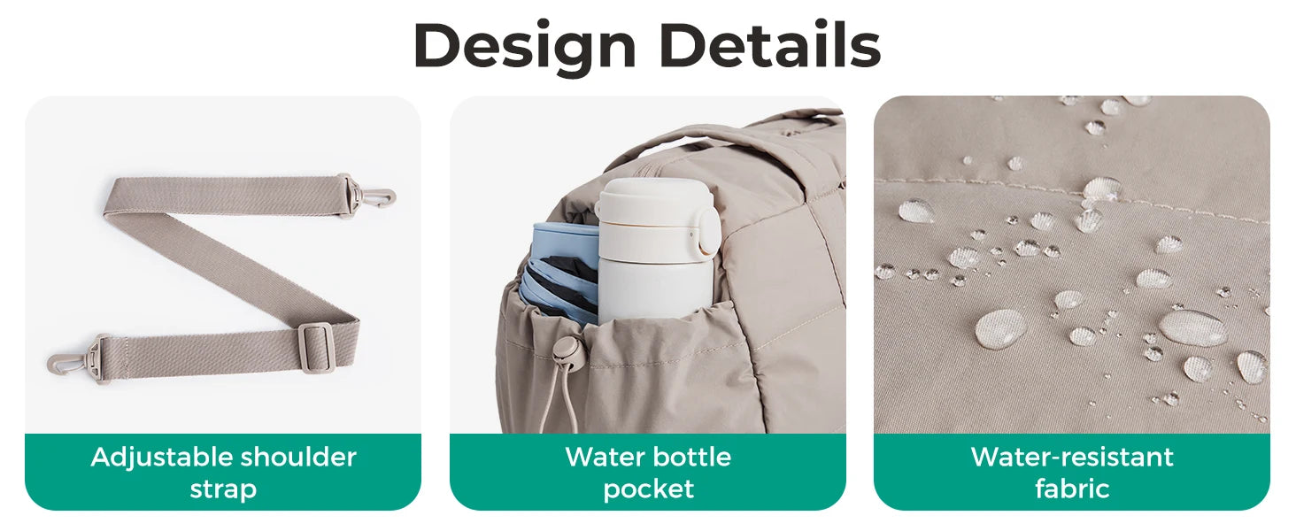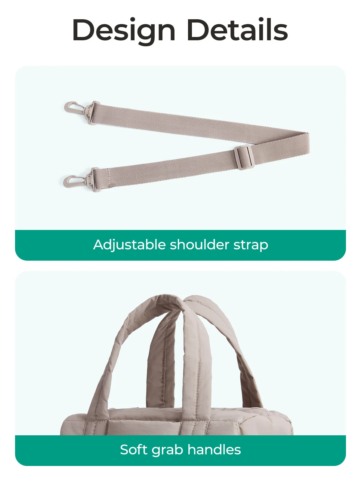 Commuting Shoulder Bag: Quick-grab side pocket on the small duffle for your phone, plus interior slots for cards and lip balm. Roomy enough for daily errands, baby essentials, or a mini makeup touch-up kit