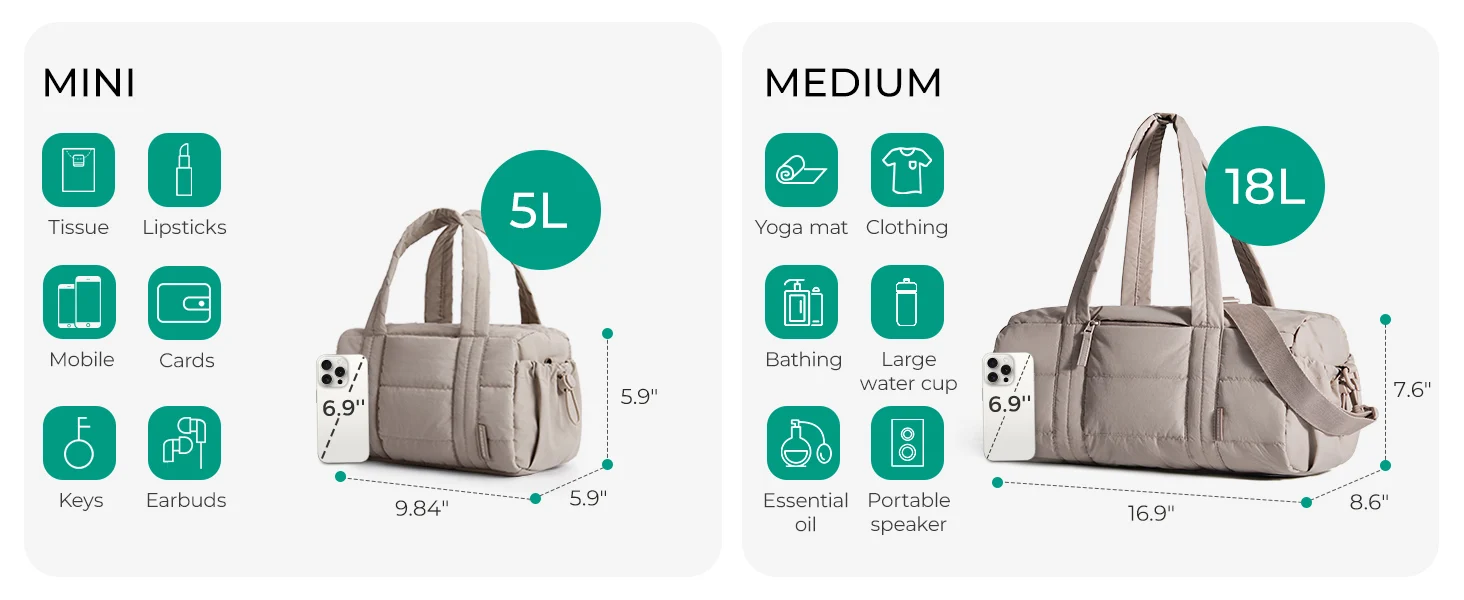 Compact Mini Duffle Bag: 25x15x15cm / 9.84"x5.9"x5.9"(iPhone 16 Pro heights 5.89"). Surprisingly roomy—fits your gym essentials, a water bottle, and daily must-haves without bulk. Perfect for minimalists who hate oversized bags