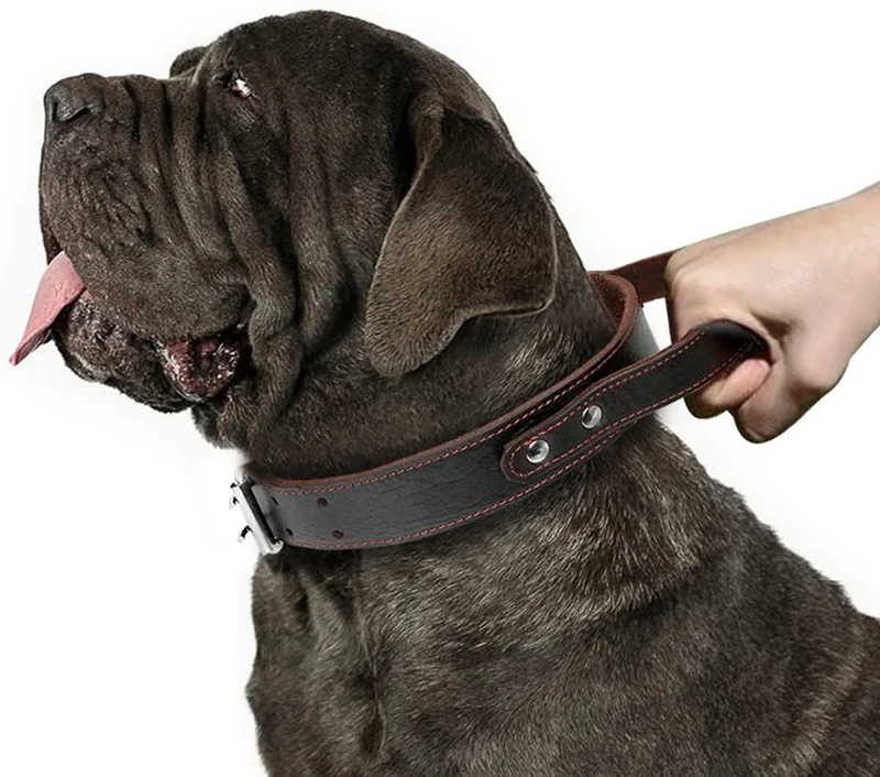 HANDLE + D RING DESIGN--The handle on the collar is specially designed for confident and quick control during dog walking and training, each side of the handle with 2 rivets to ensure it`s durable enough for heavy-duty using; The "D" ring beside the buckle available for connecting a leash to use as a common leather collar