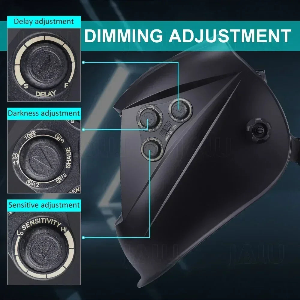 Auto-darkening welding filter and Variable adjusted by internal knob, According to the actual working situation, the parameters of darkness sensitivity and delay are self-defined, Different from the previous traditional mask, it is more intelligent, convenient and cost-effective.