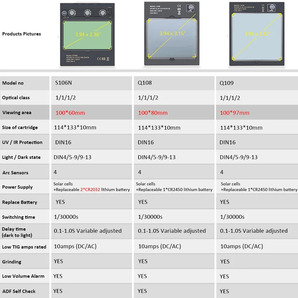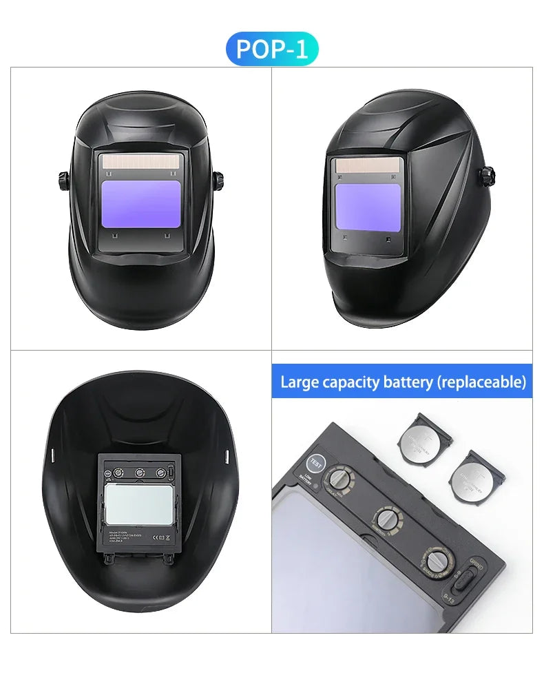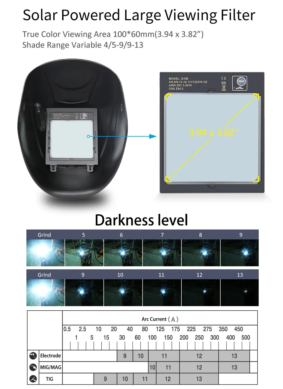Great For TIG MIG MMA,Plasma Applicayions with Grinding Fea-ture.The Auto Darkening Filter enables welders to adapt to vari-ous working environments by controlling the shade of the lensBattery powered with solar panel technology and Eco-friendlyCR2450 Lithium battery for longer life (up to 5000 hrs).