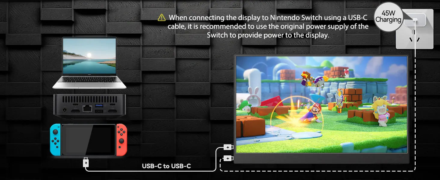 The monitor can be connected to a Nintendo Switch with USB-C connection or through the HDMI dock. It is recommended to use the original power supply of the Switch to power the monitor.