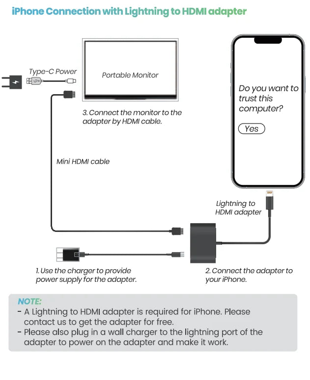 How are the cables connected? - HDMI ConnectionWhen using HDMI for A/V signal transmission, the monitor requires a separate power connection. The model F13NA(FHD) requires a 10W PD power supply.