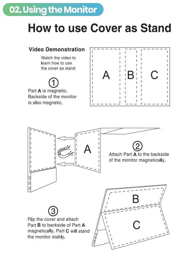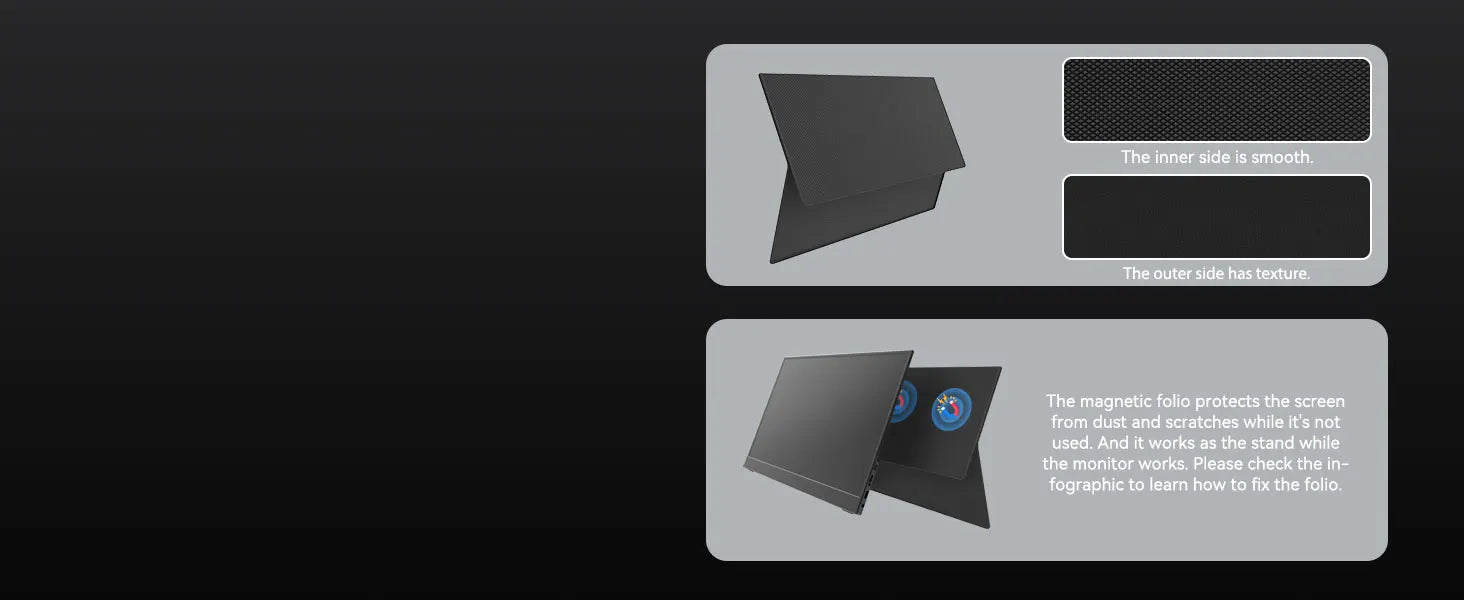 The magnetic folio protects the screen from dust and scratches while it's not used. And it works as the stand while the monitor works. Please check the infographic to learn how to fix the folio.