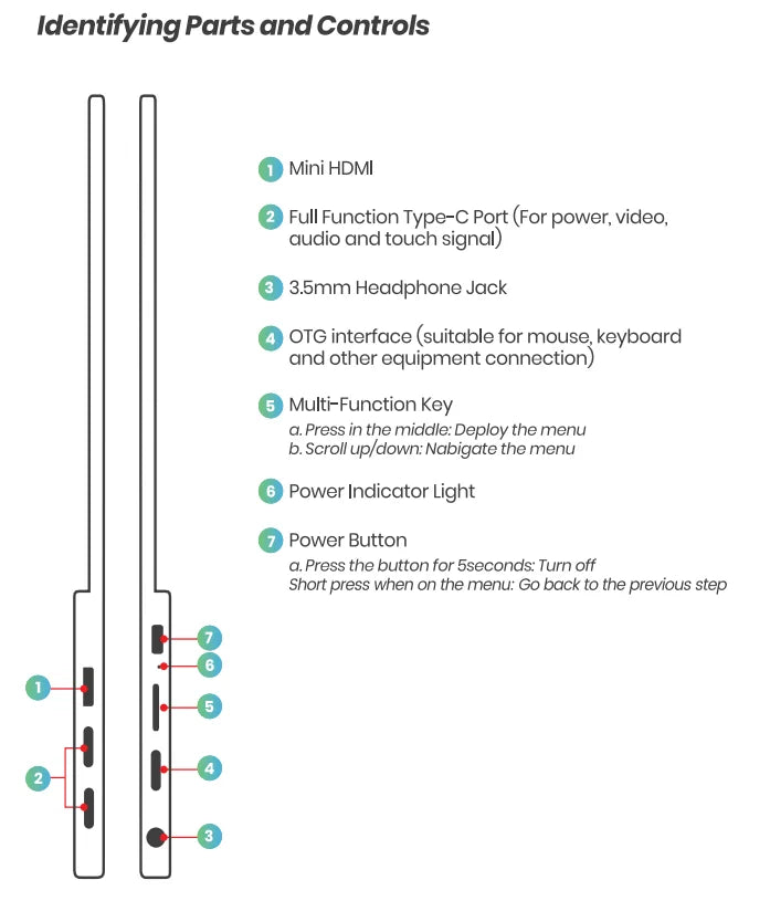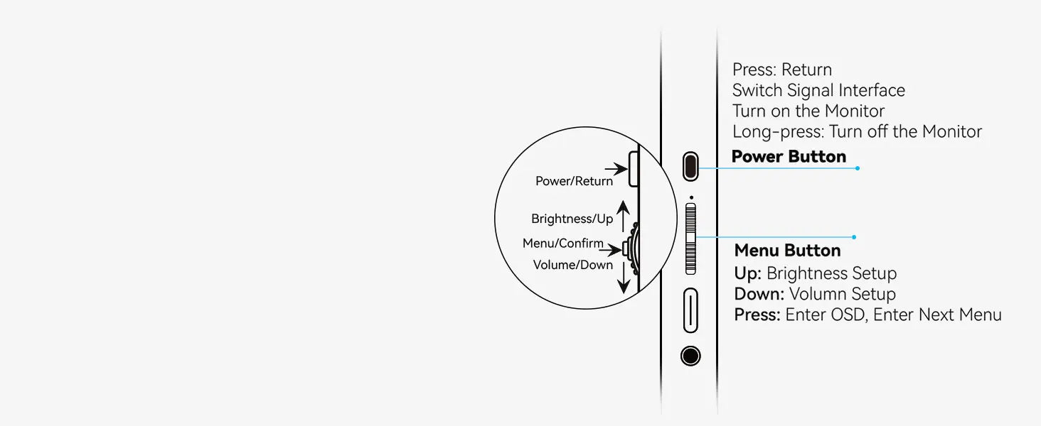 The monitor offers two full-function USB Type-C ports and a mini HDMI port on the right side. Most modern laptops and mini PCs can connect to the monitor with a single USB-C cable for seamless operation. The HDMI port provides convenient connectivity for gaming consoles or using the monitor as a large display for DSLR cameras. The right side of the monitor also houses menu and power buttons, indicator lights, and headphone and OTG ports.