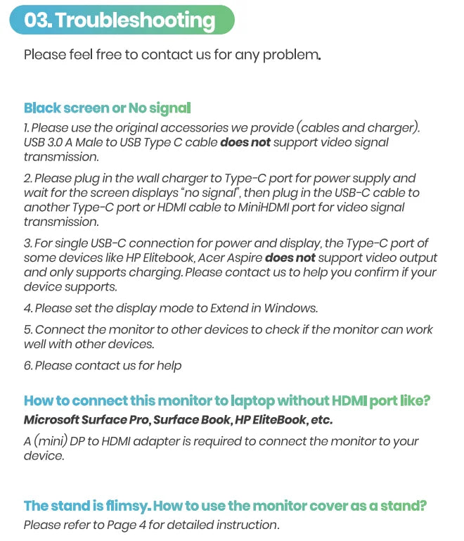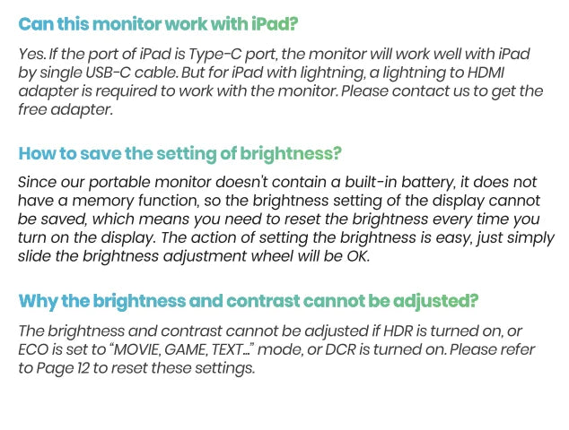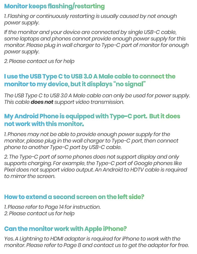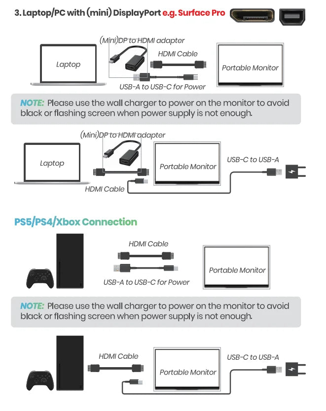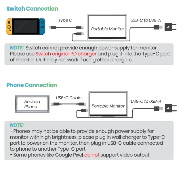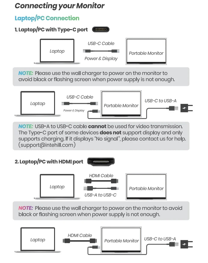 How are the cables connected? - USB-C ConnectionWhen transmitting A/V signals through a USB-C cable, if the mini PC or laptop can provide sufficient power, the monitor does not require additional power. Otherwise, additional power supply is needed