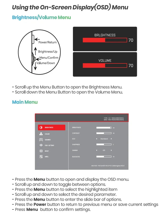 There are shortcut keys to make it easier to use. Toggle up the menu button to set brightness, toggle down it to set volume. Press the on/off button to return to the previous level or launch the menu.