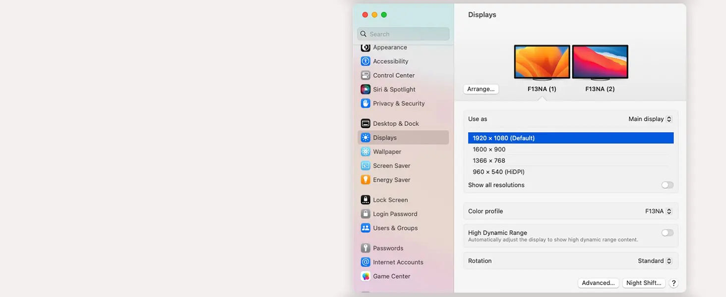 Multiple-Displays Setup on macOSSystem Settings > Displays >Use as >Main display/ Extended display/Mirror >Arrange > Show all resolutions > Rotation