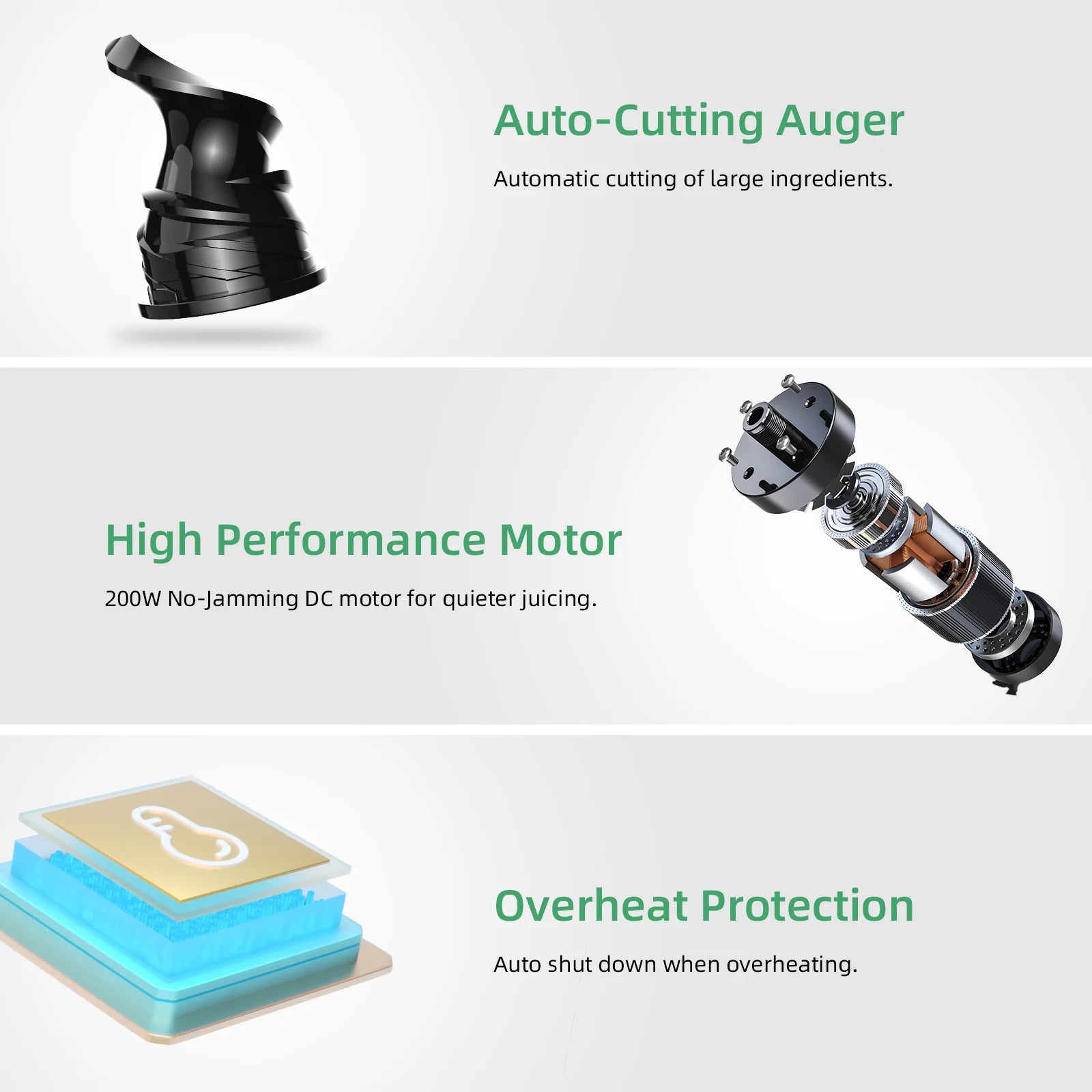 [Faster Juicing, Less Clogging] - The 200W high torque motor can help reduce the amount of time needed to extract juice from fruits and vegetables, making it a more efficient option for busy individuals. Less likely to clog or jam, even when juicing harder or denser produce.