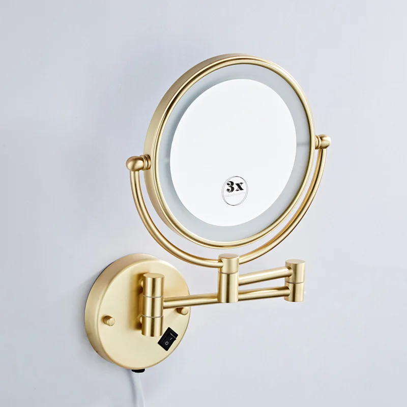 Brushed Gold LED Makeup Mirror with Brass Folding Bathroom Mirrors of 8 Inch 3X 5X Maynifying Makeup Mirror Dual Face LED Mirror