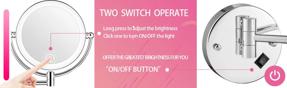 Different from other tri-fold magnifying mirror with lights, lighted makeup mirror with 360° swivel joint allows easy movement of the mirror's face for great viewing at any angle.