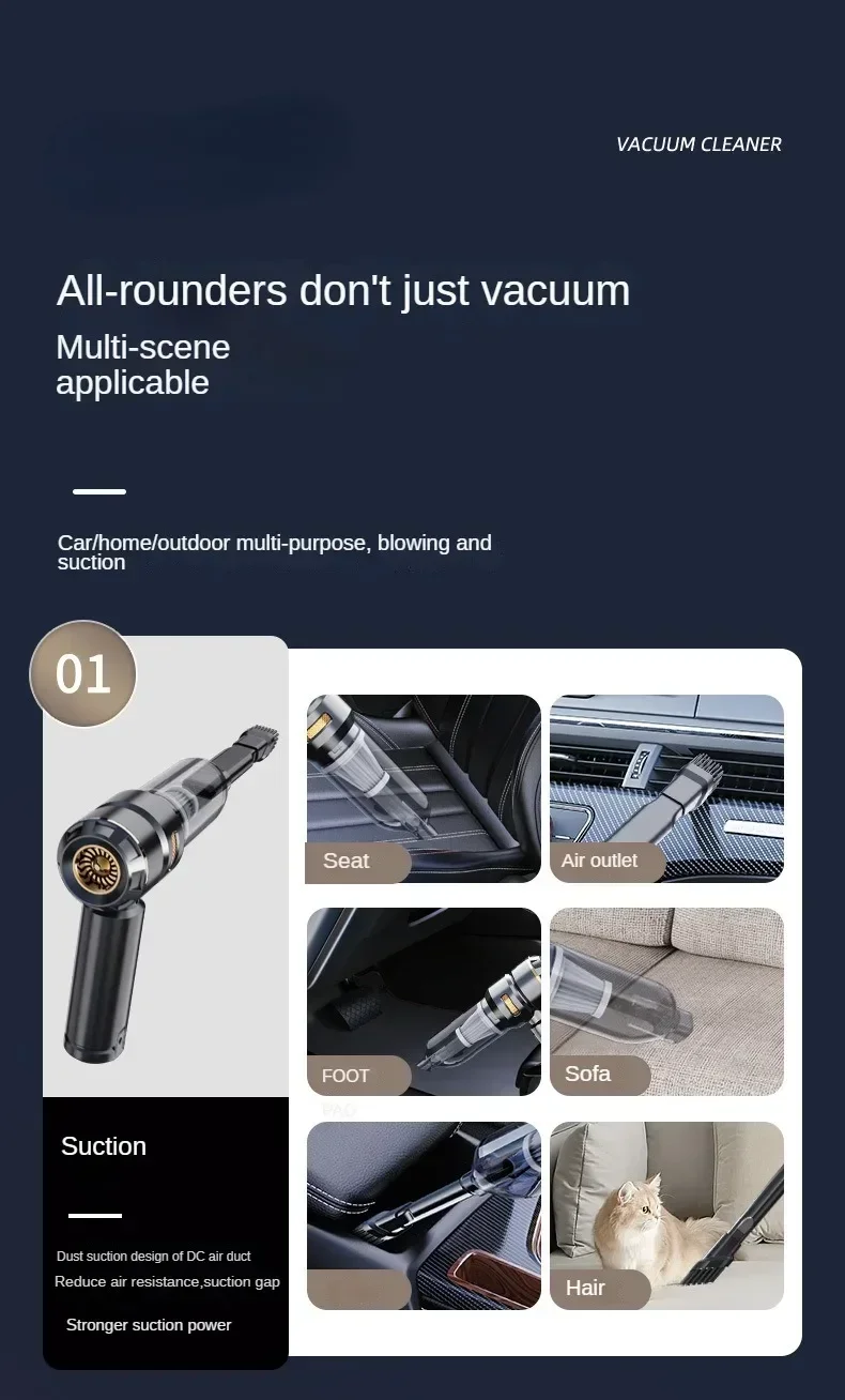 Perfectly designed for car cleaning, this portable and handheld wireless machine is here to satisfy all your requirements. The powerful brushless motor combined with the powerful air duster feature makes this vacuum cleaner perfect for cleaning dust, debris, pet hair, crumbs, and other small particles in your car and home. It is lightweight, easy to use, and convenient to store, making it an ideal cleaning tool for your car and home. Whether you need it for your daily cleaning routine or for long road trips, our Car Vacuum Cleaner has got you covered! With its wireless feature, you can use it anytime, anywhere without the need for charging cables or power sources. Its compact and sleek design allows you to clean tight spaces without feeling uncomfortable. Order now and experience the convenience of our Car Vacuum Cleaner!