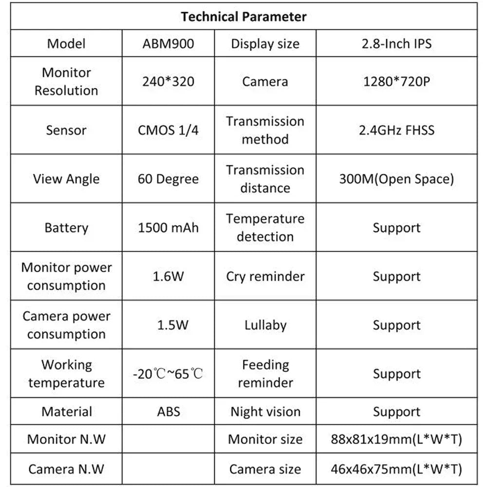 Feature: Intercom,Baby Cry Alarm,Feeding Time Reminder,Temperature Monitoring,LCD Display,Nightlight,Power Saver,Portable,Music
