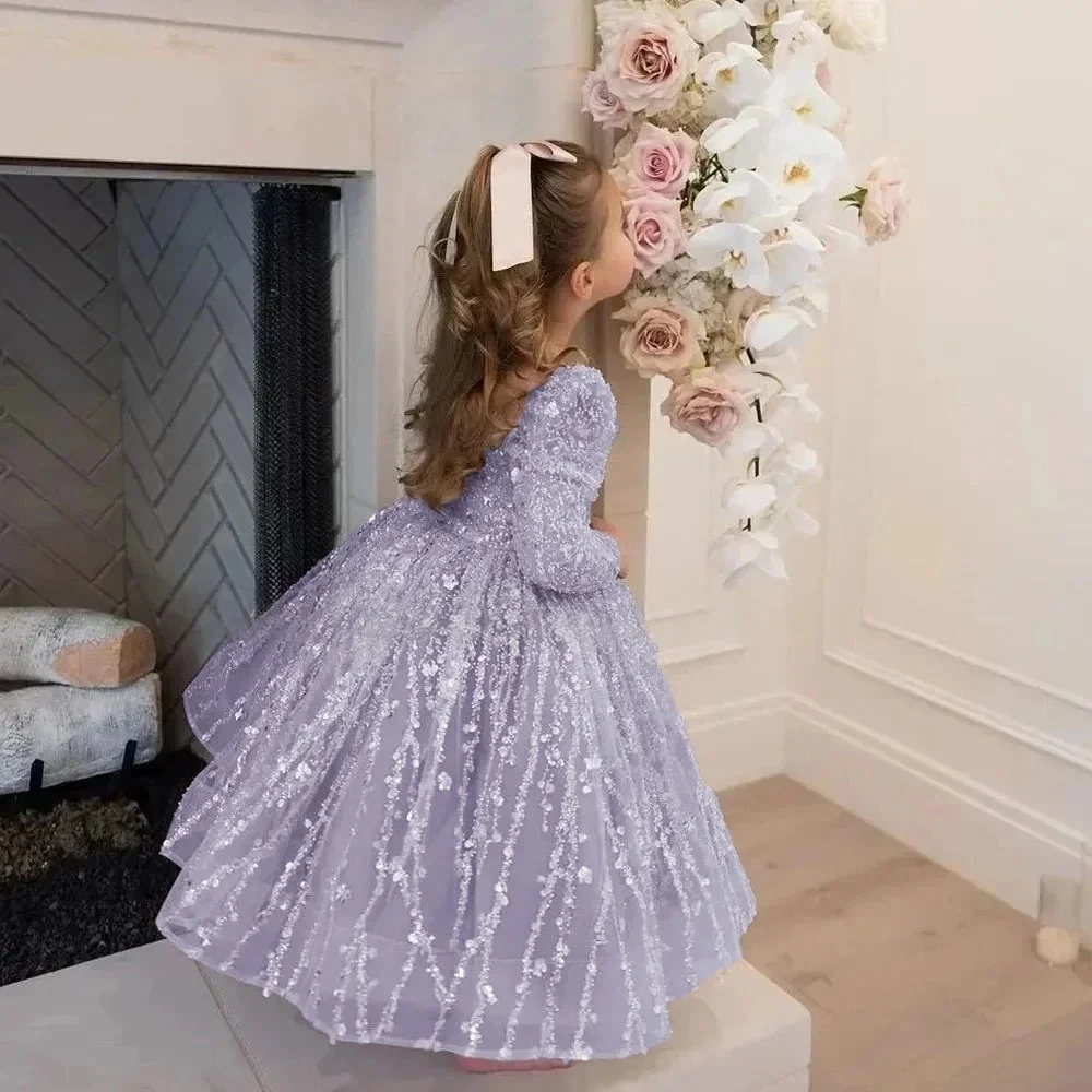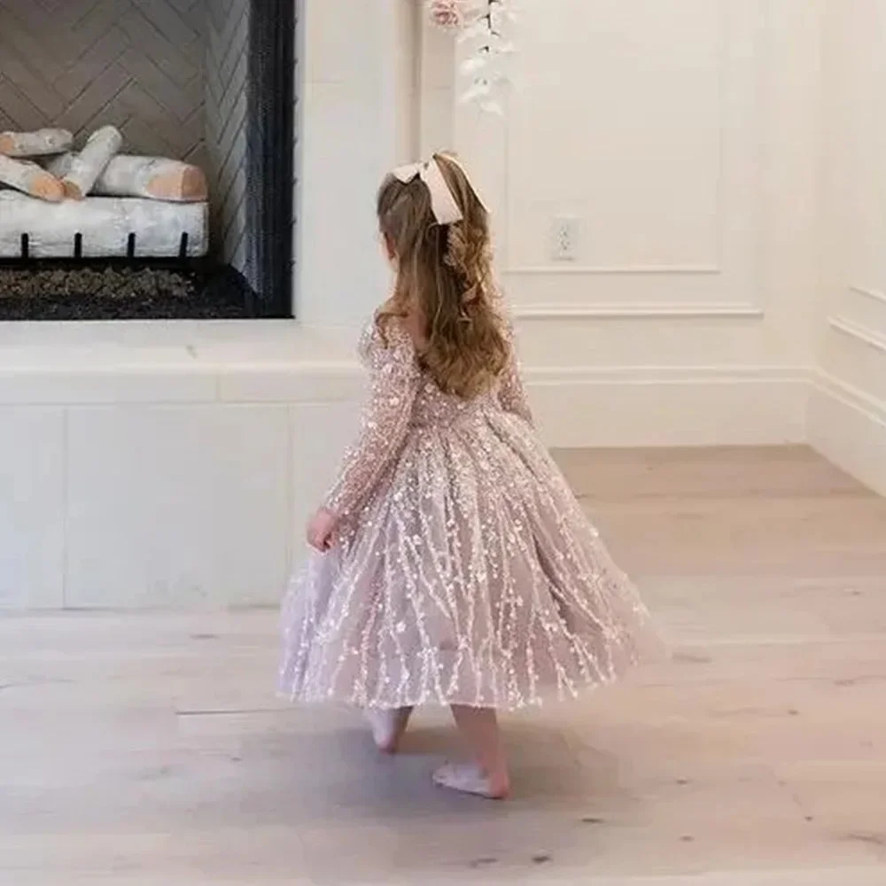 Custom Flower Girl Dress First Christmas Dress Wedding Party Gown Blush Pink Sequin Lace Long Sleeve Kids Evening Dress فسات