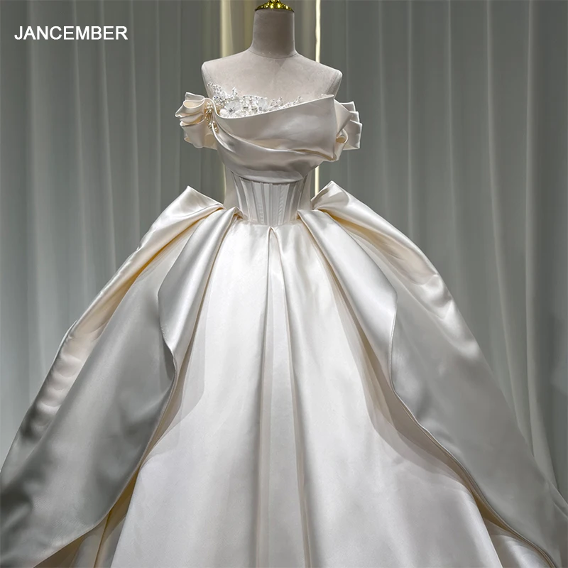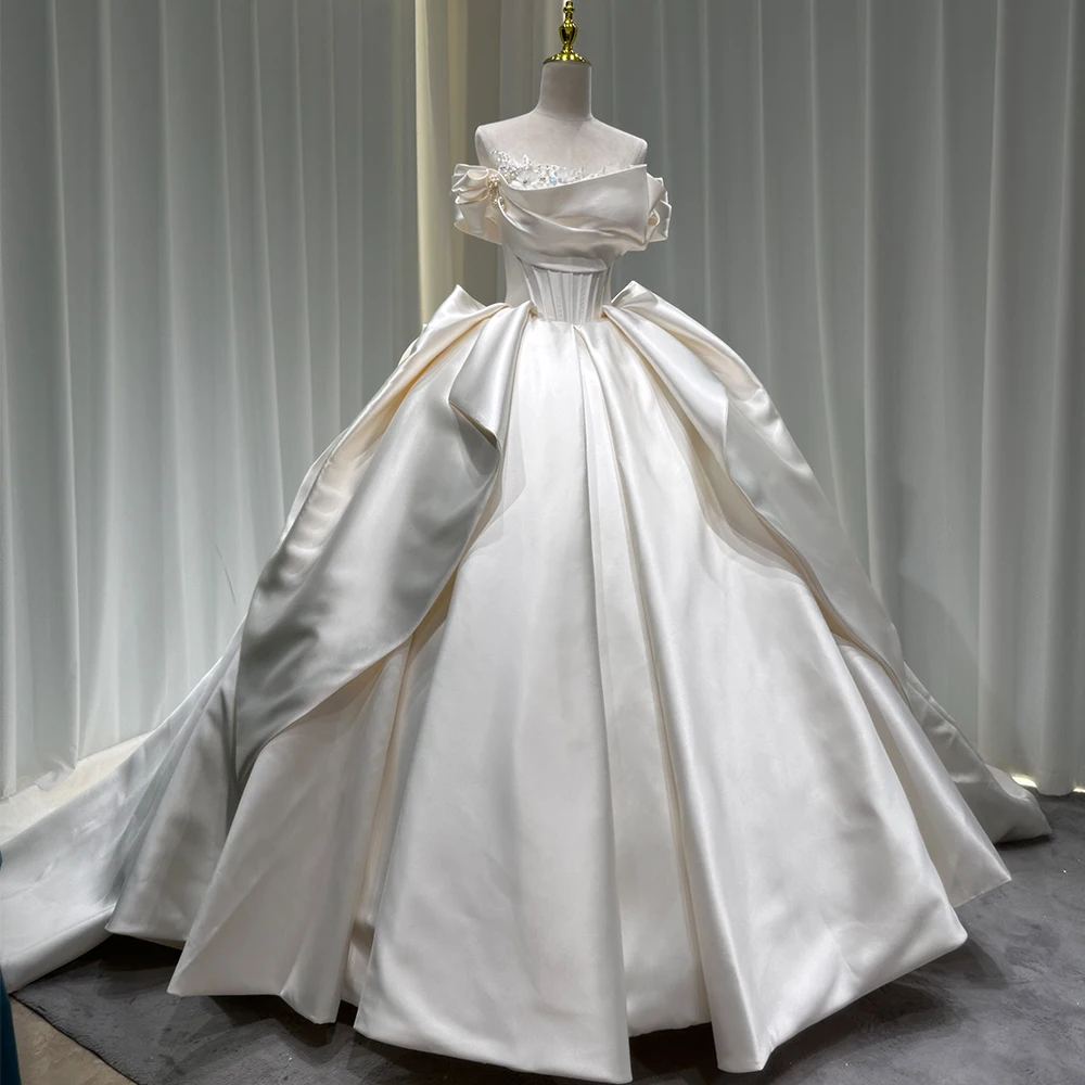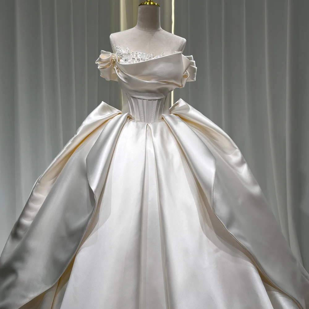 Key word: Off Shoulder Satin Layered Cathedral Train Pearl Wedding Dress