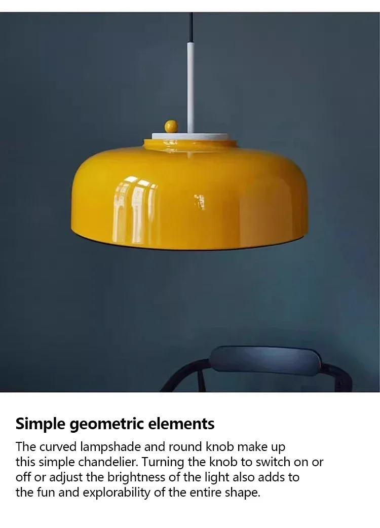 The curved lampshade and round knob make up this simple chandelier. Turning the knob to switch on or off or adjust the brightness of the light also adds to the fun and explorability of the entire shape.
