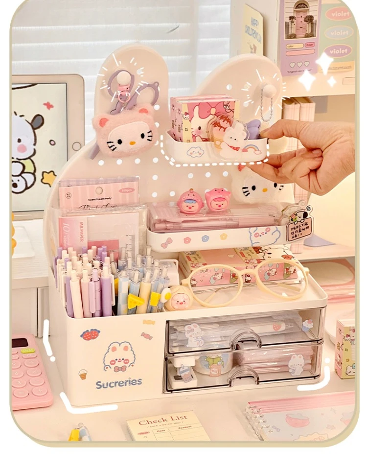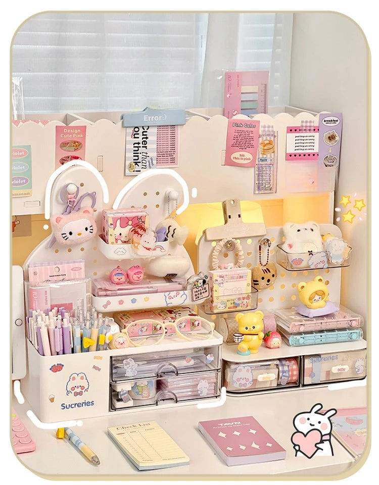 Desktop Hole Board Storage Box Desk Organizer Girls Cute Pen Holder Storage Stationary Rack Korean Kawaii Bunny Cosmetic Shelf