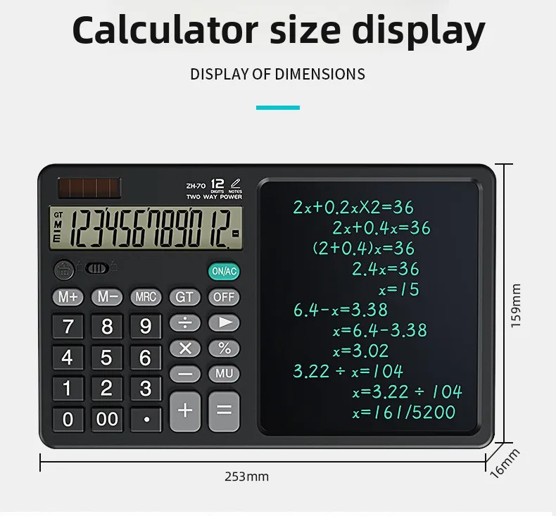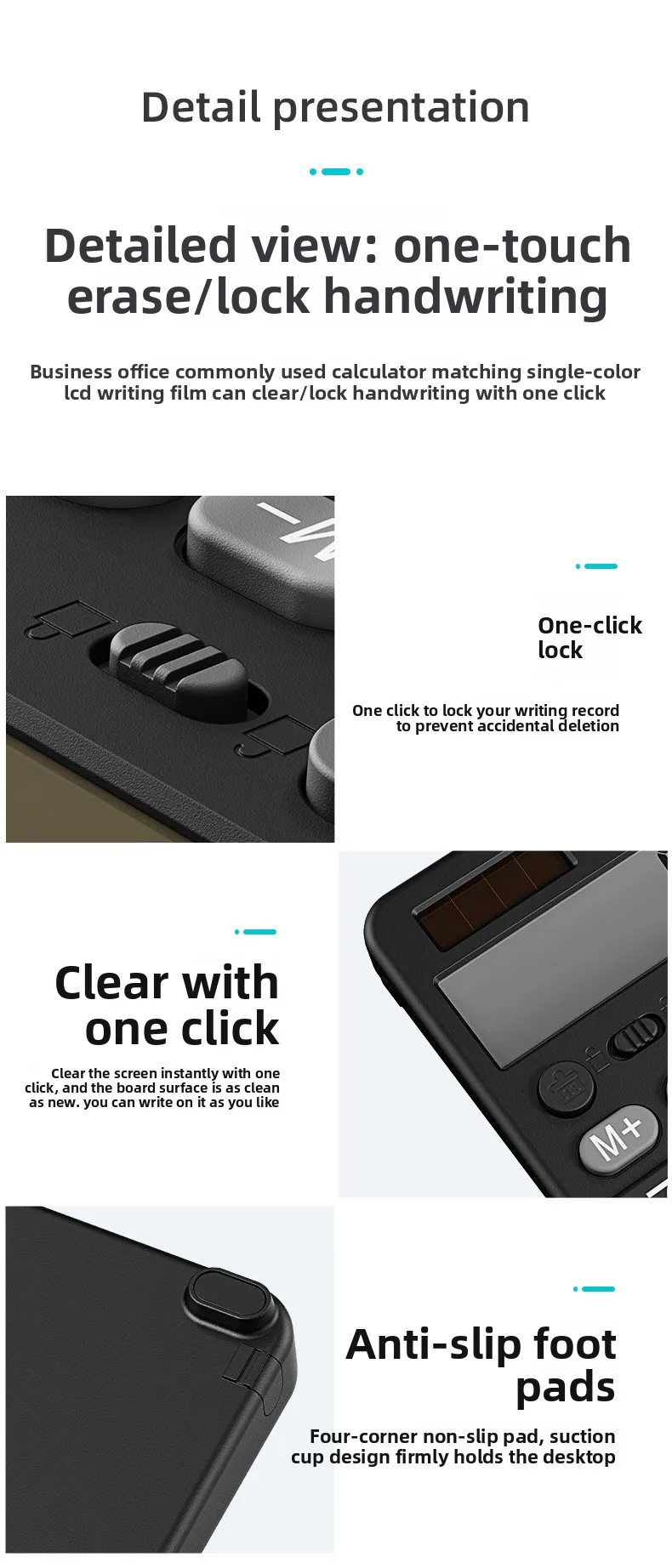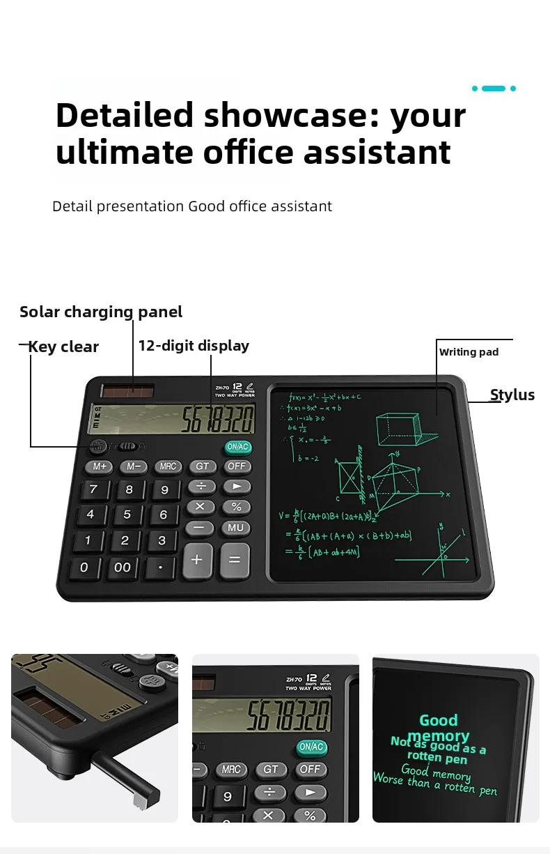Desktop office calculator; Financial accounting; School office; Teacher student writing draft memo; Handwriting board computer.