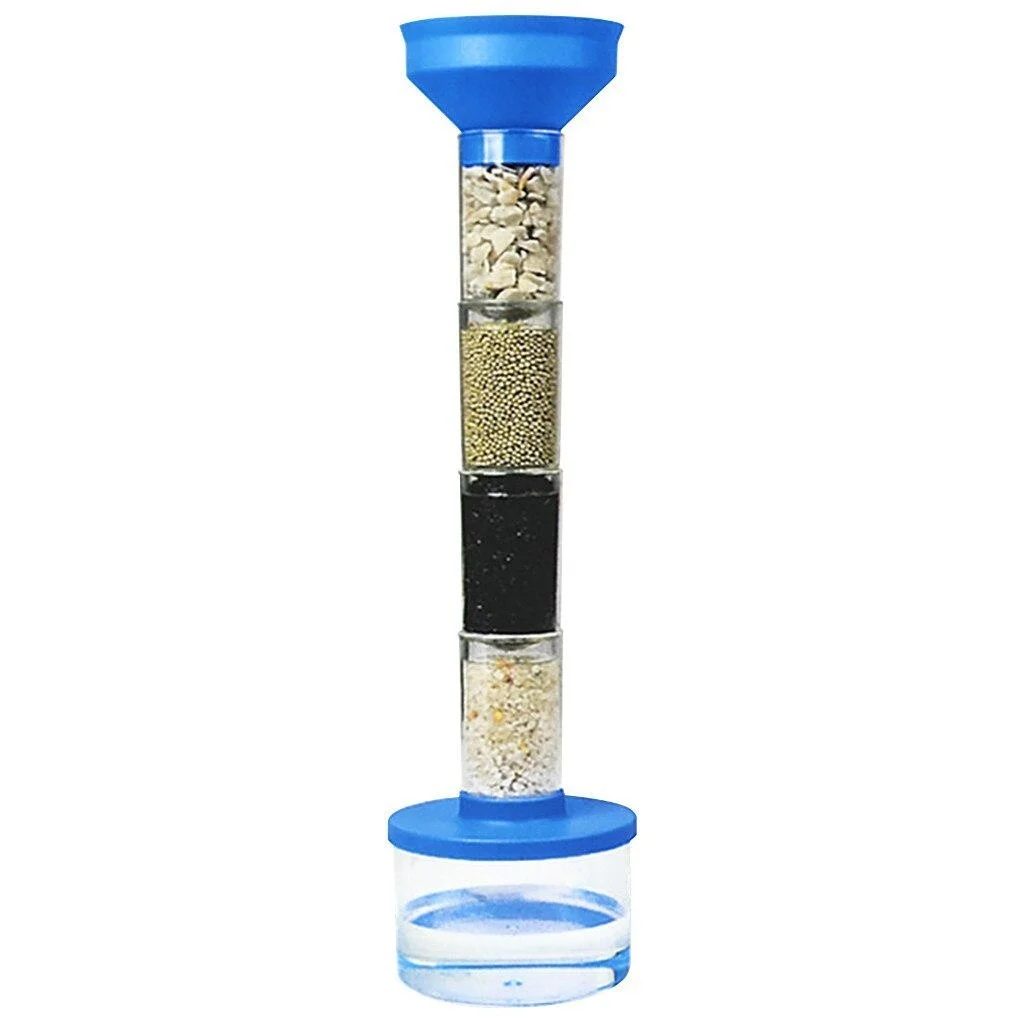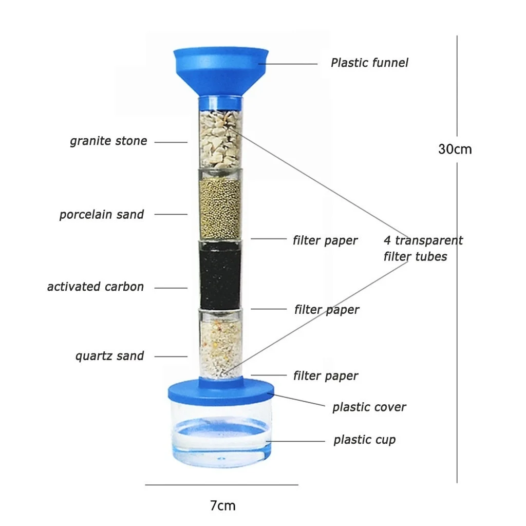 1 pack of Huanggang stones 1 pack of porcelain sand 1 pack of activated carbon 1 pack of quartz sand 1 pack of baking soda 1 pack of potassium alum 6 sheets of filter paper 2 pieces of sponge 1 filter device 1 manual.